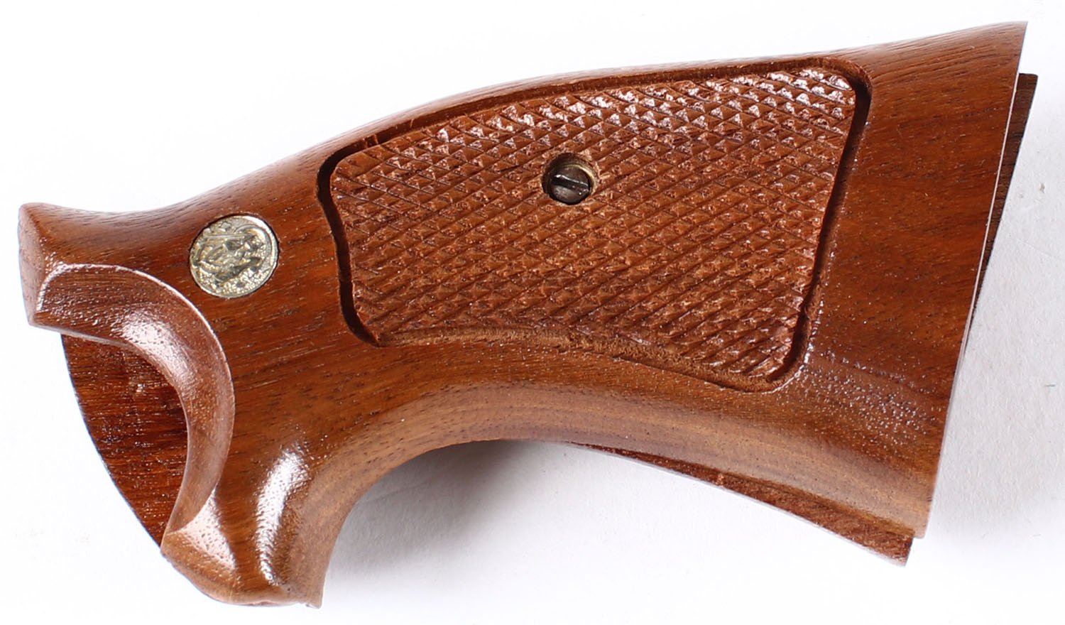 S&W Revolver Checkered wood Grips, has screw. Grade: Excellent - Value: 30 to 90