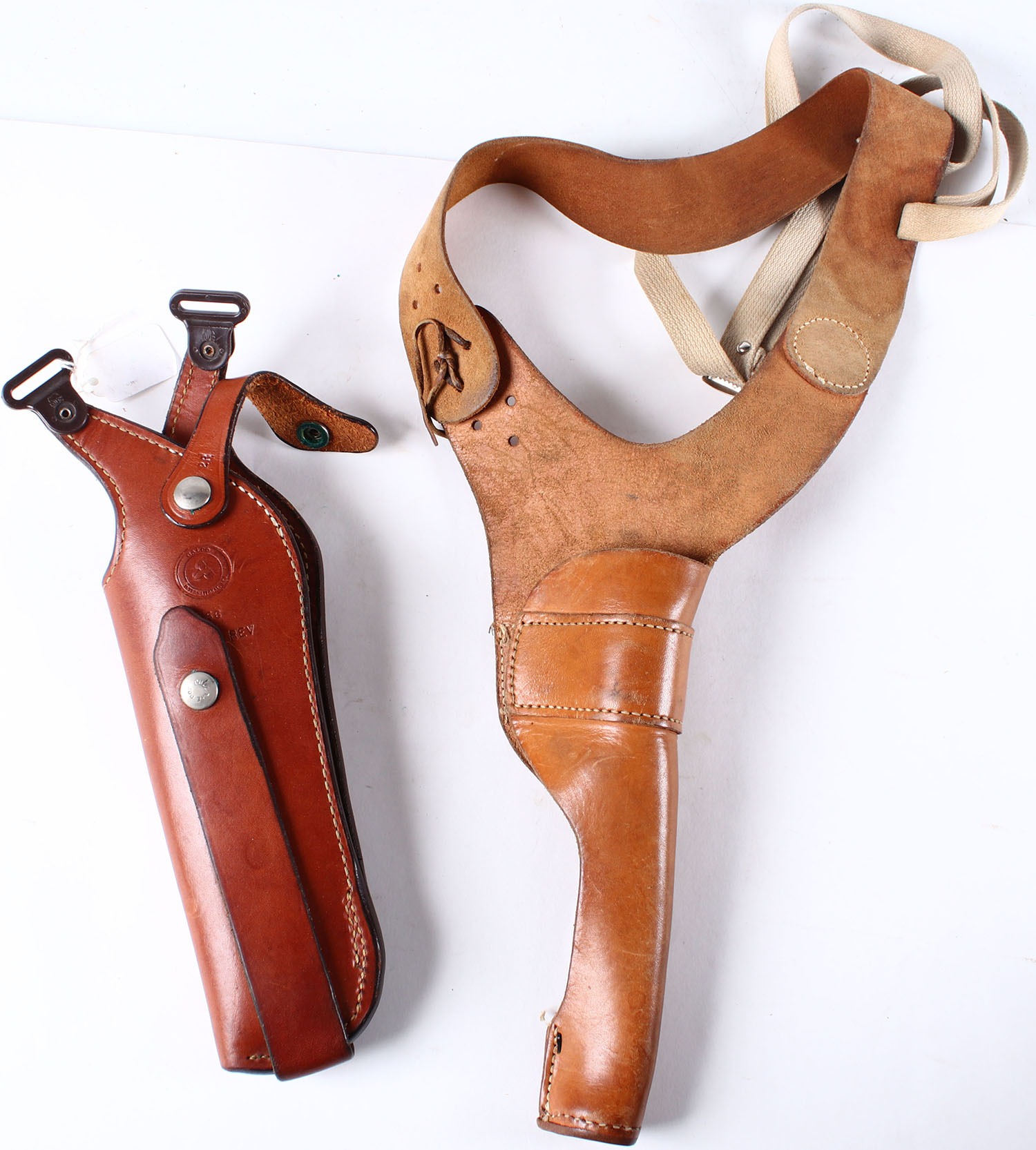 Lot of 2 leather pistol holster, shoulder straps. Grade: Excellent - Value: 20 to 60