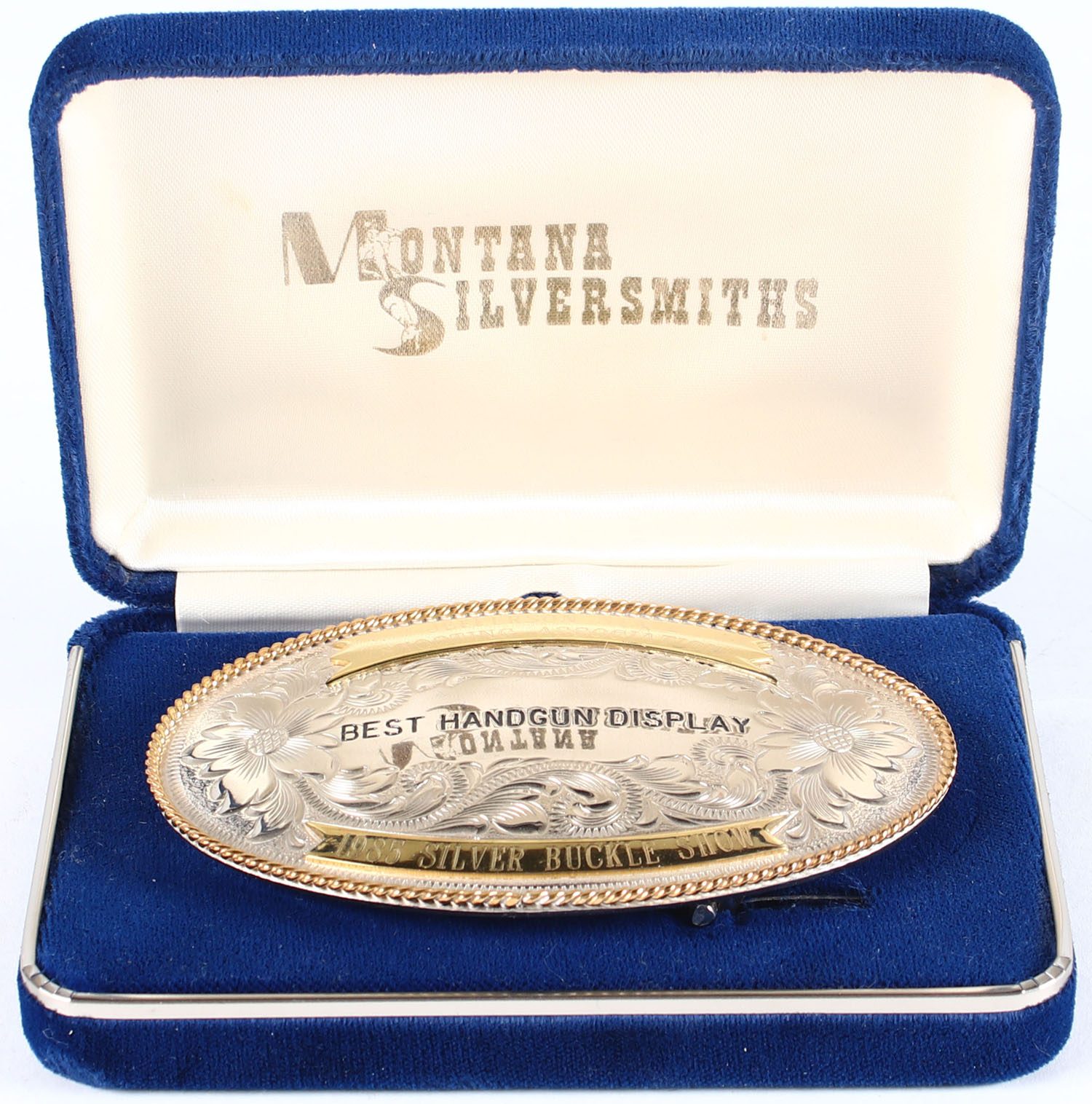 Intricate belt buckle, Jefferson State shooting assc. Best handgun display 1985. Grade: Excellent ++ - Value: 20 to 80