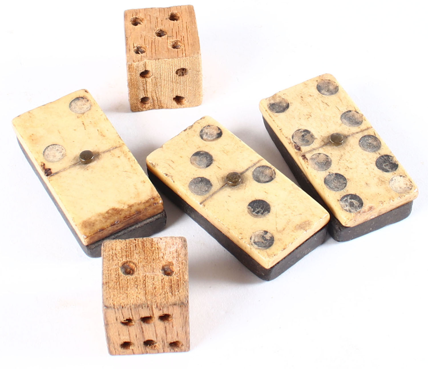 Early cowboy gambling 3 bone over ebony dominos with 2 large wood hand carved dice. Grade: Excellent - Value: 10 to 60