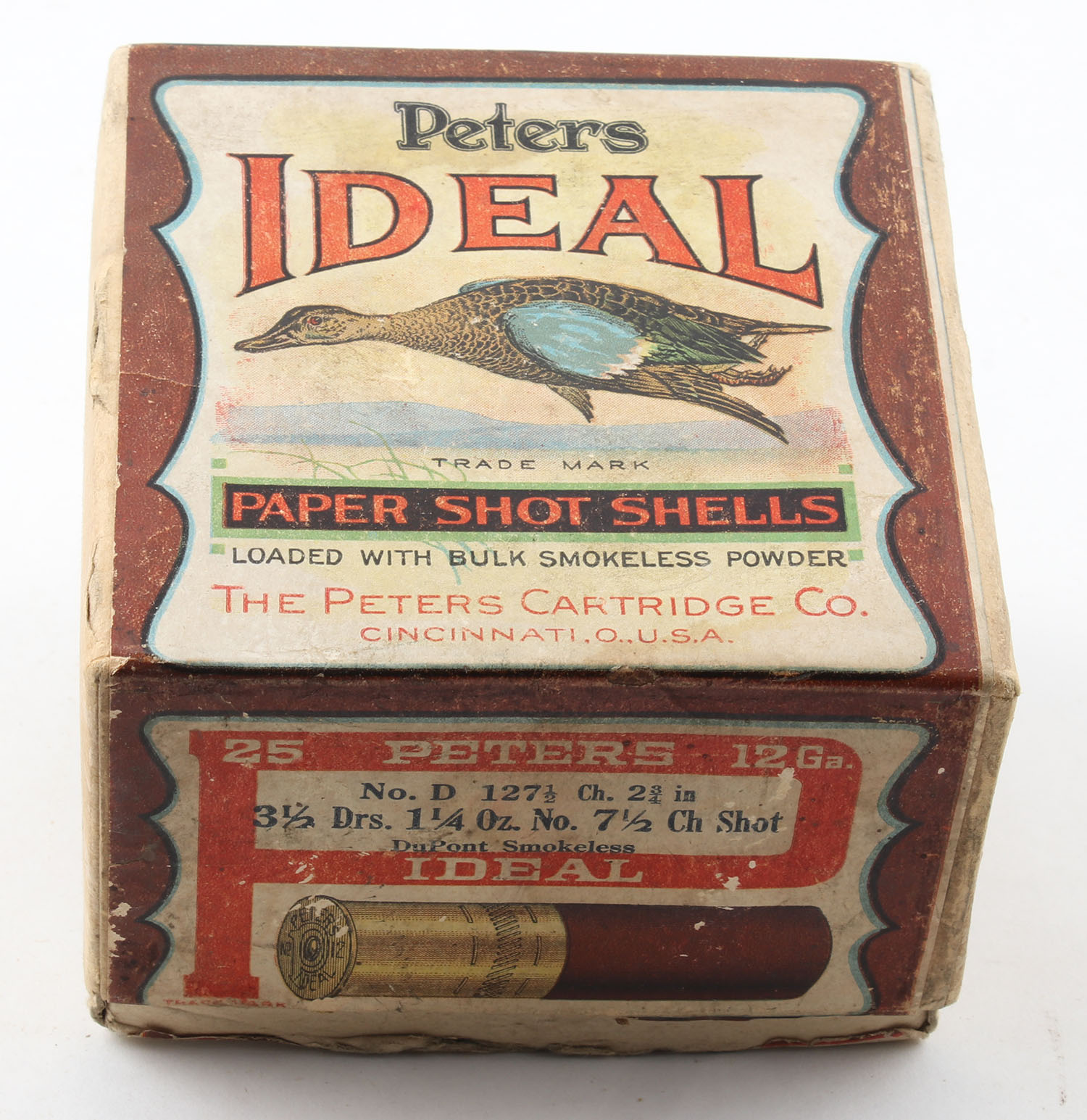 Peters Cart. Co., IDEAL, Blue Wing Teal, 12ga., 2pc., Full of fired shells, shot size 7 1/2CH., buff box with multi-colored label that pictures Blue Wing Teal in flight, box has some age soiling with edge & corner wear, bottom has a seam split due to shell protrusion, fired shells are fair. Grade: Very Good ++ - Value: 500 to 1200