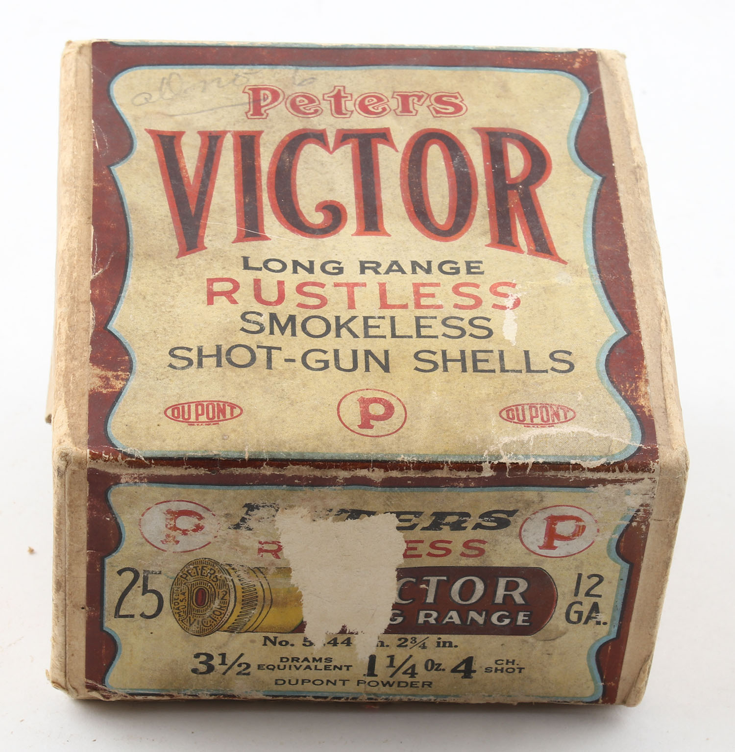 Peters Cart. Div., Victor, Rustless, 12ga., 2 3/4'', 2pc., Empty, shot size 4 CH, buff box with brown, cream & black label, box has age soiling & edge wear, has a partial tear to side label, label is 90% intact. Grade: Good ++ - Value: 20 to 40