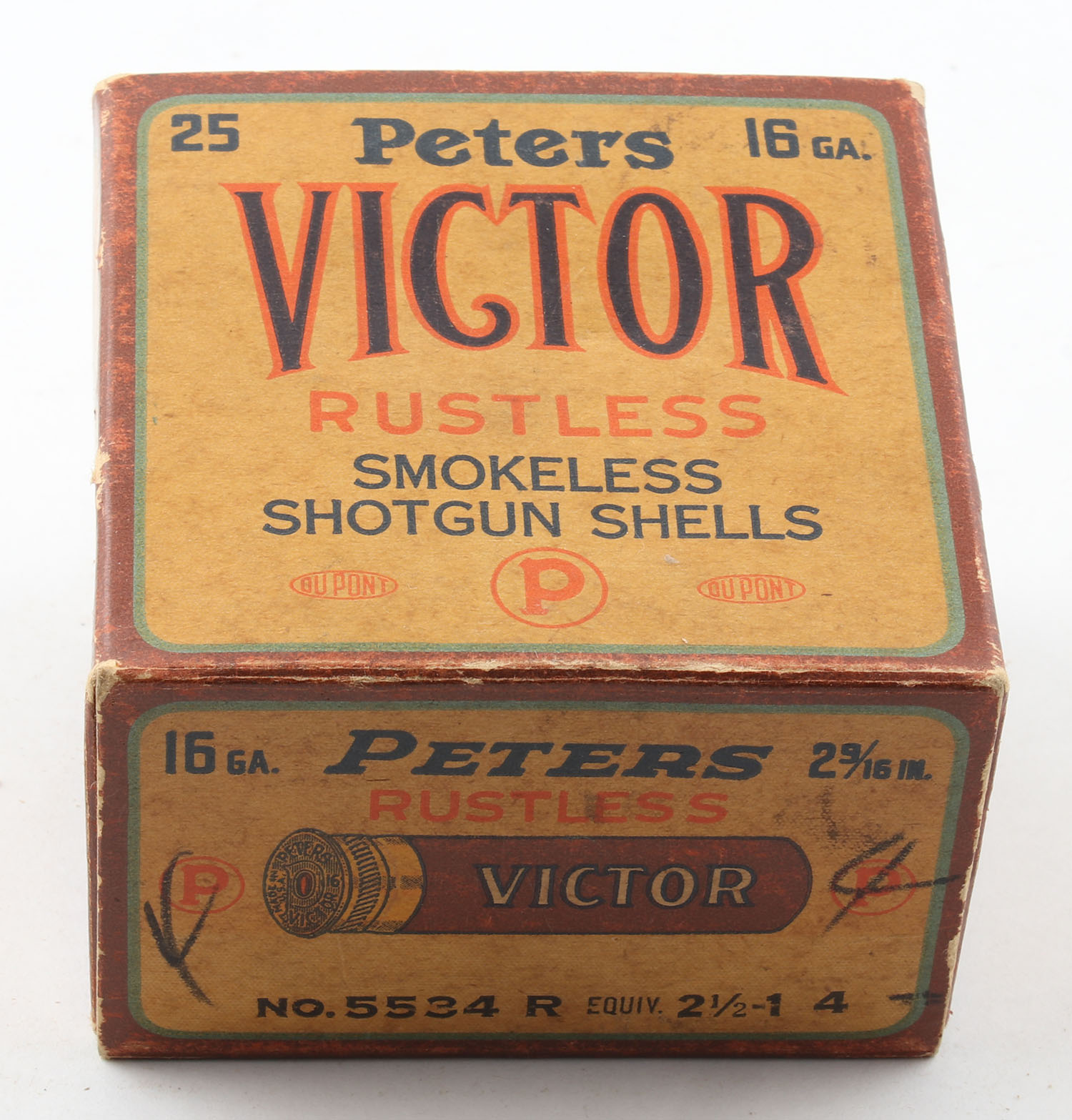 Peters, Victor, 16ga., 1pc., Full, shot size 4, 2 9/16'', Maroon, cream & orange box, box is solid with minor edge wear, box has excellent colors, paper shells are excellent. Grade: Excellent - Value: 20 to 60
