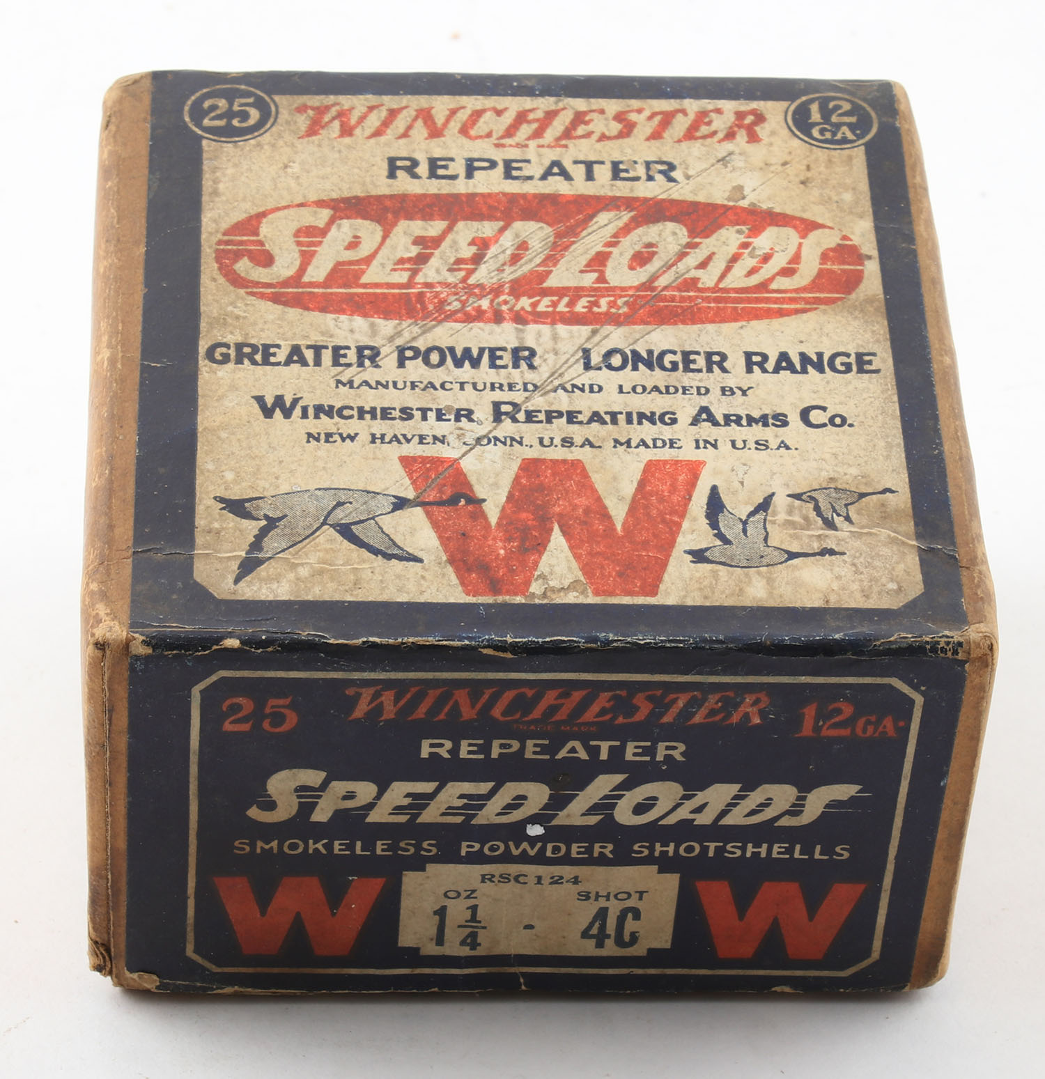 Winchester REPEATER Speed Loads, 12 Gauge, 2pc., Empty., shot size 4C, buff box with dark blue red & white paper label, Box has age soiling with scuffing & edge wear, RARE with the REPEATER markings, label is intact with great colors. Grade: Very Good - Value: 80 to 200