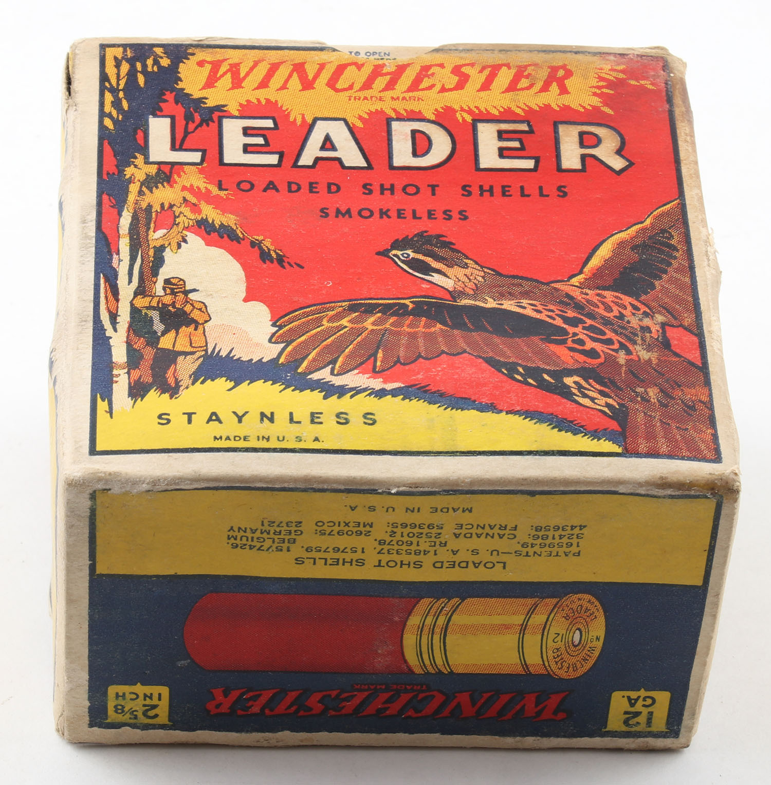 Winchester, LEADER QUAIL BOX, 12ga., 1pc., Full, shot size 6 CH, 2 5/8'', multi colored box with flying Quail & hunter in background, box has light age soiling with light shell protrusions, has edge & corner wear with some scuffing, paper shells are very good. Grade: Very Good ++ - Value: 500 to 1000