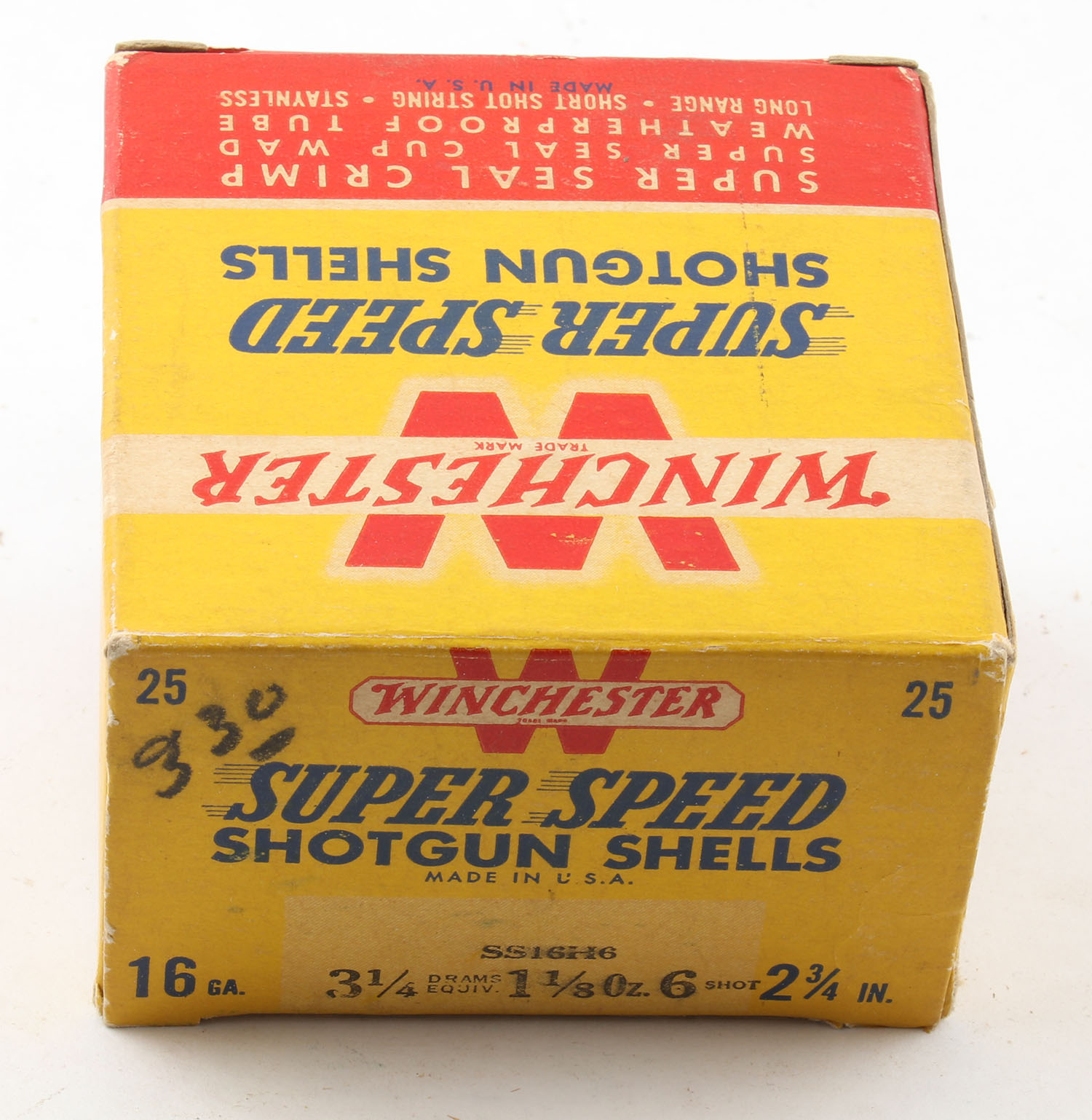 Winchester, Super Speed, 16ga., 2 3/4'', 1pc., Full, shot size 6, red, black, and yellow box, box is very solid with excellent colors, paper shells are excellent. Grade: Excellent + - Value: 10 to 40