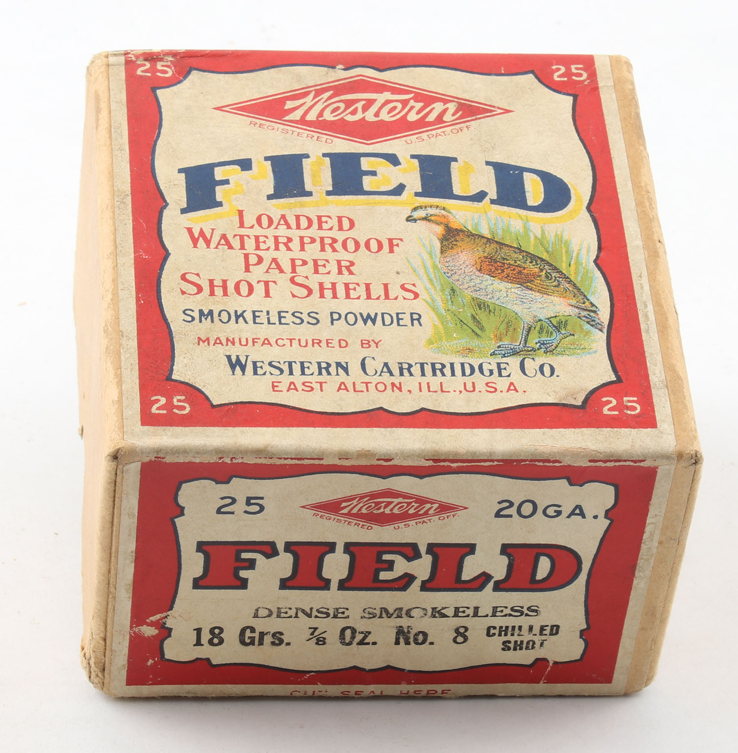 Western, Field, 20ga., 2pc., Empty, shot size 8Ch., buff box with multi-colored label, box is solid with light age soiling, label is intact with great colors. Grade: Excellent - Value: 100 to 300