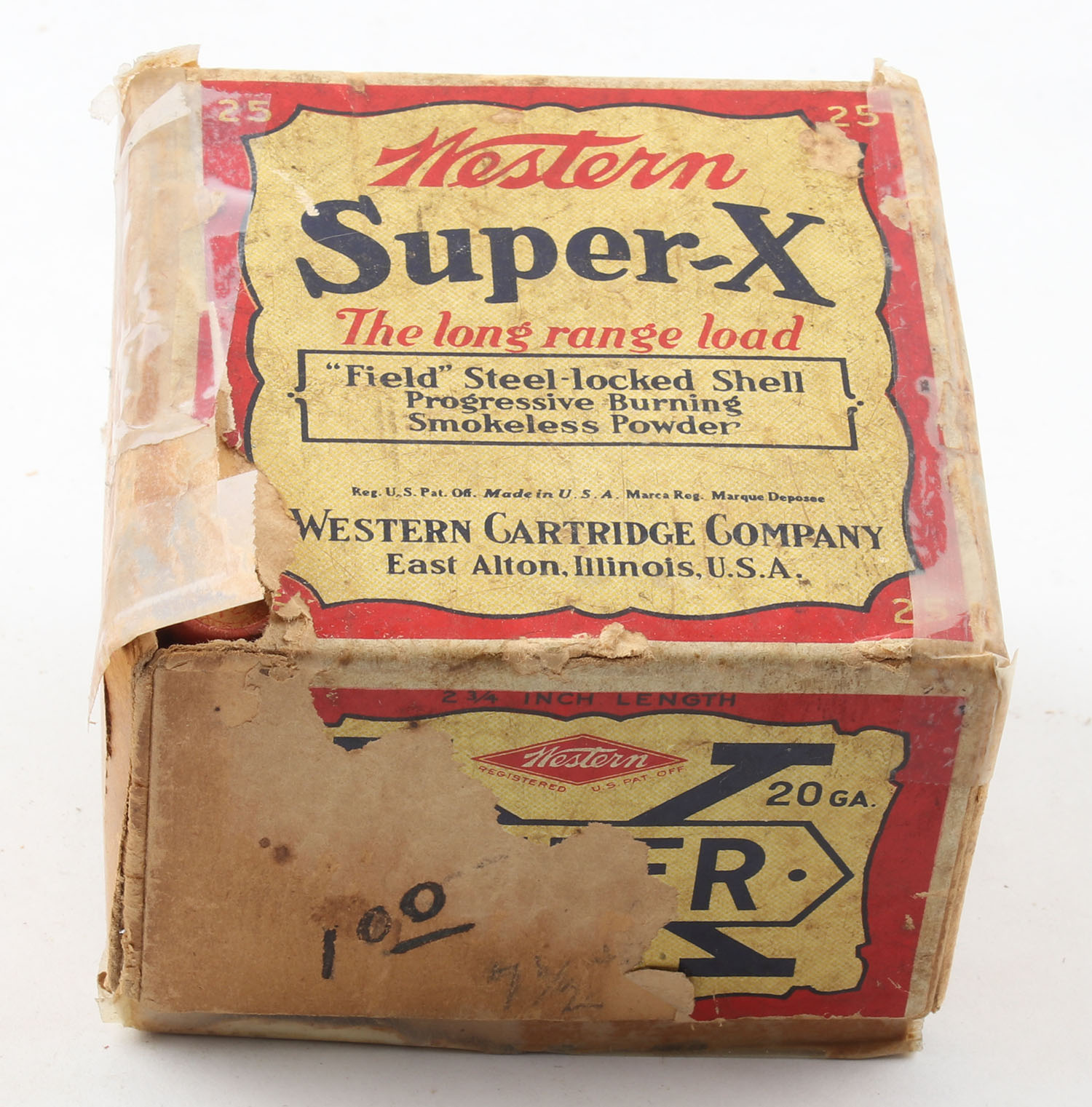 Western, Super X, 20ga., 2pc., Full, shot size 7 1/2Ch., buff box with multi-colored label, box has seam splits to top & bottom with tape repairs, side label is partially torn, label is about 85% intact, paper shells are excellent. Grade: Good - Value: 20 to 60