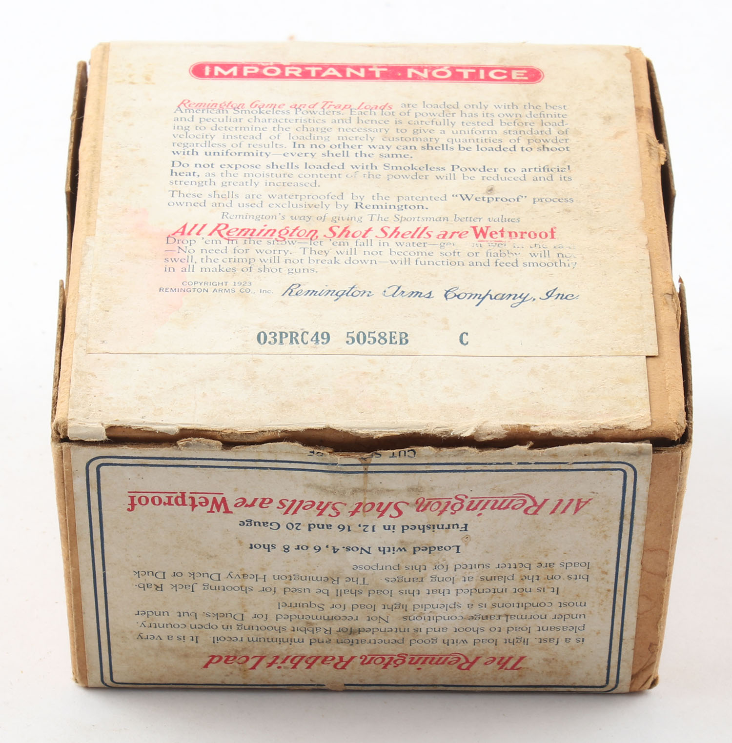 Remington UMC, Nitro Club, GAME LOADS, RABBIT LOAD, 12ga., 2pc., Full of Fired shells with 8 being correct, shot size 4, buff box with sunburst logo & RABBIT on side, box has age soiling with some edge wear, fired shells are fair. Grade: Good ++ - Value: 100 to 400