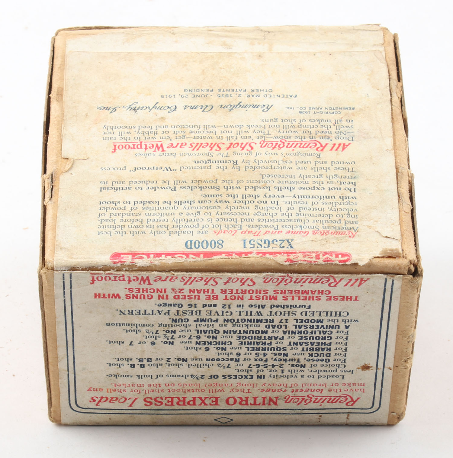 Remington Nitro Express Long Range GAME LOADS, Flying Mallard, 20ga., 2pc., Empty, shot size 6 CH, buff box with sunburst logo, box has light age soiling & light edge wear, label is intact. Grade: Very Good ++ - Value: 20 to 80