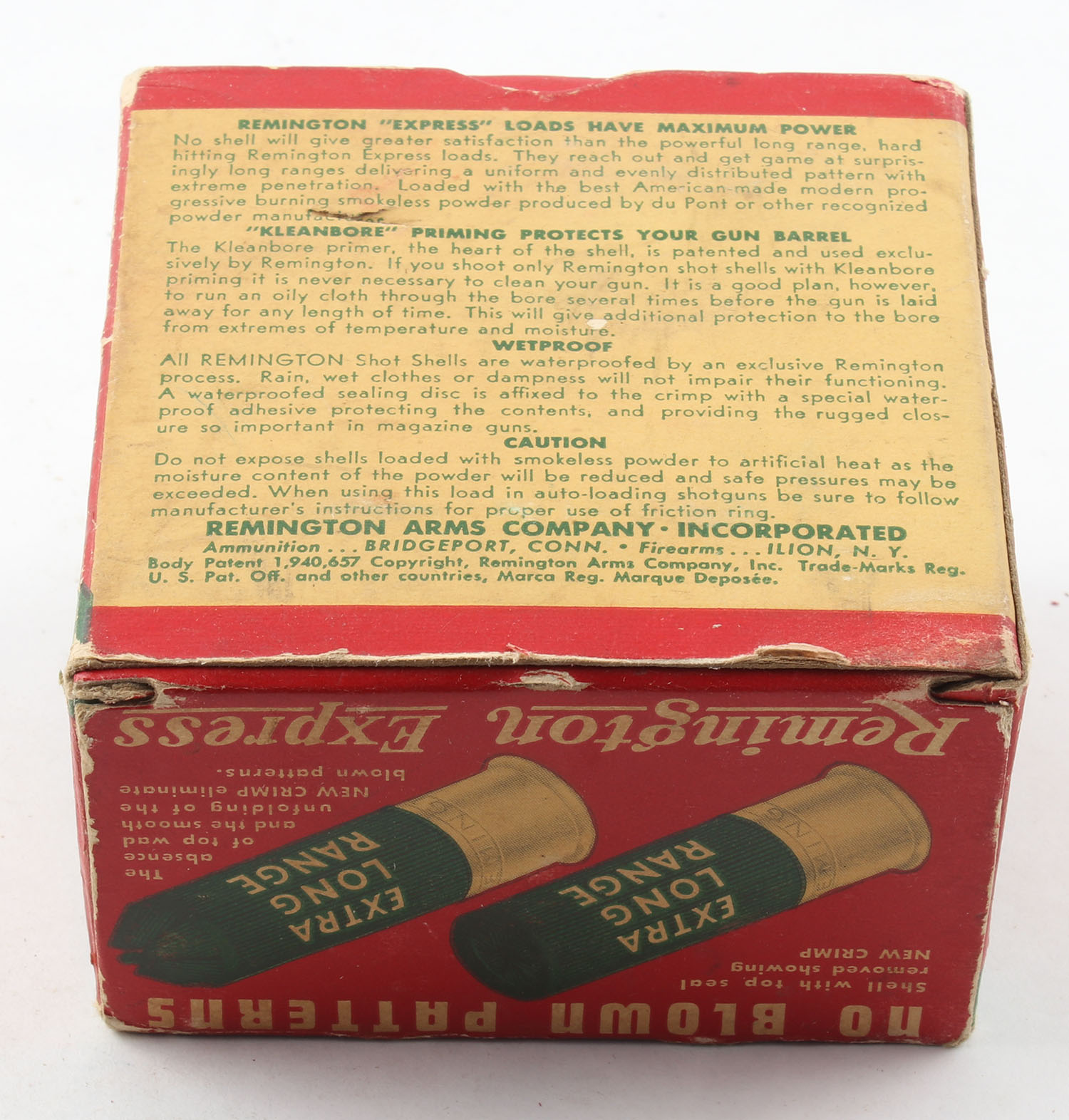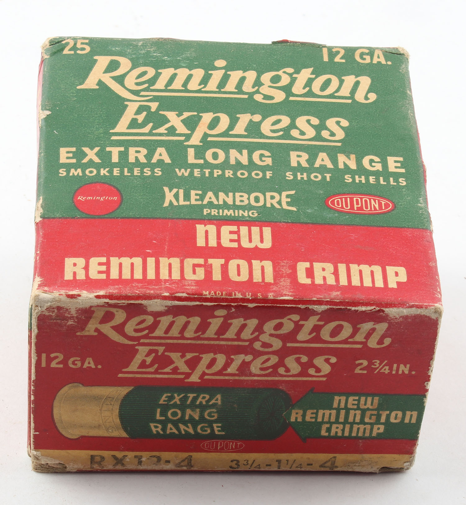Remington Express, Extra Long Range, 12ga., 2 3/4'', 1pc., Full, shot size 4, box is red, white and green, box has edge & corner wear, paper shells are good. Grade: Very Good - Value: 10 to 30