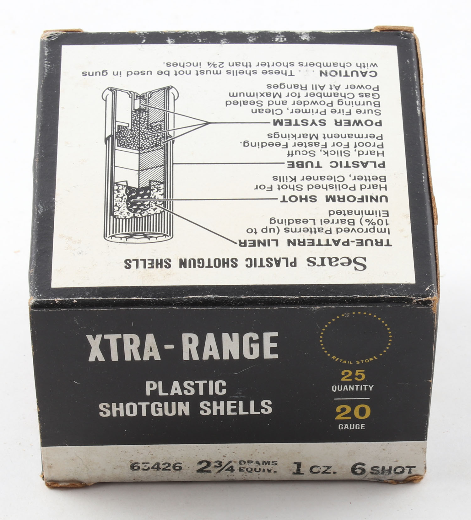 Sears, Xtra-Range, 20ga., 1pc., Full, Shot Size 6, multi-colored box, box is solid, plastic shells are excellent. Grade: Very Good ++ - Value: 10 to 30