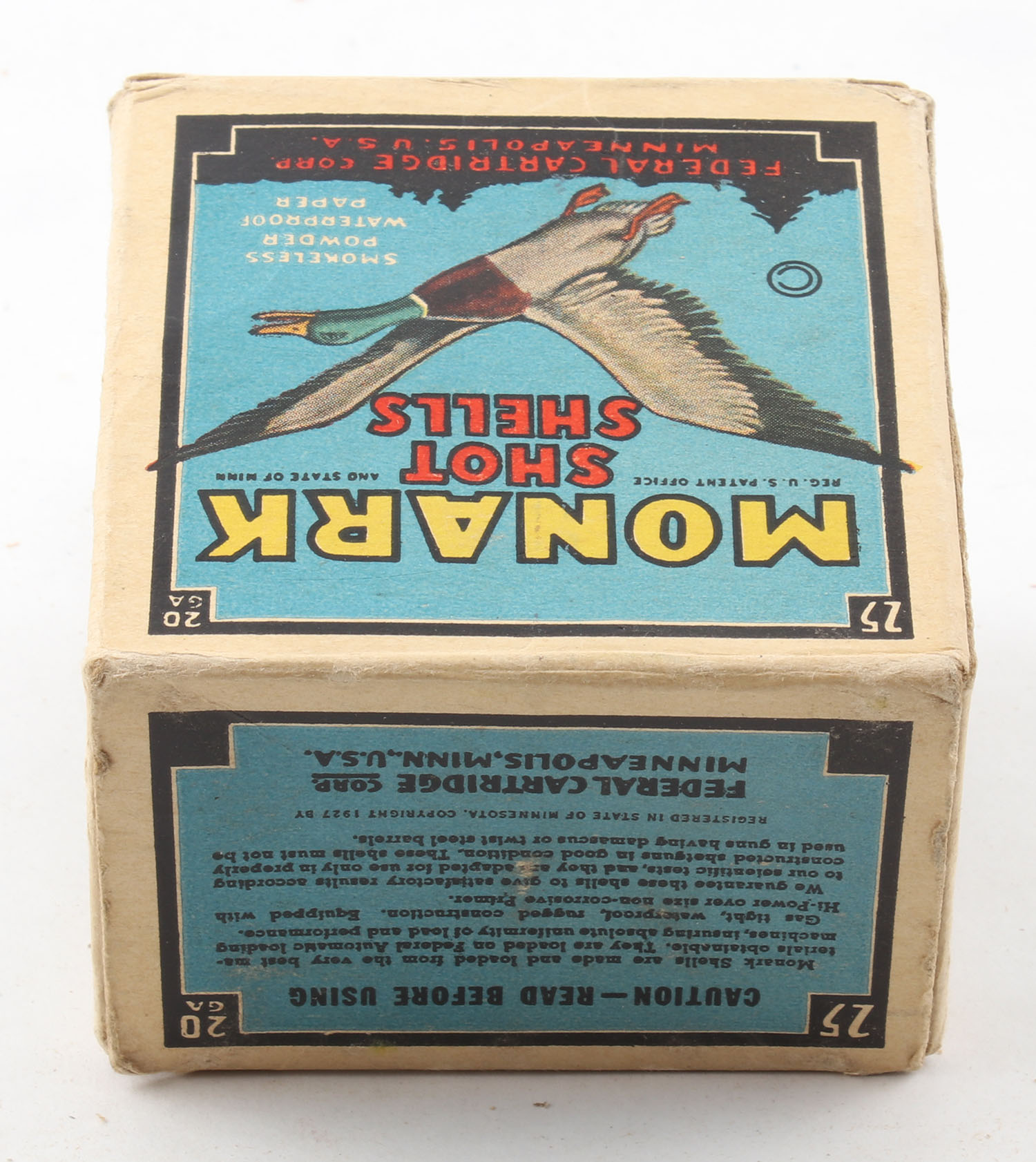 Federal Cart. Co., MONARK, 20ga., 1pc., Empty, shot size 6CH, Black border, blue, yellow and red box with flying mallard, box has light age soiling. Grade: Very Good ++ - Value: 10 to 40