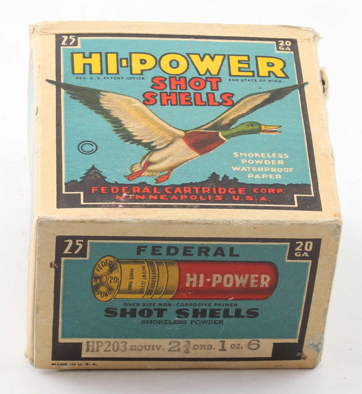 Federal Cart. Co., HI-POWER, 20ga., 1pc., Full, shot size 6, Black border, blue, yellow and red box with flying mallard, box has edge wear with excellent color, paper shells are excellent. Grade: Very Good ++ - Value: 10 to 50