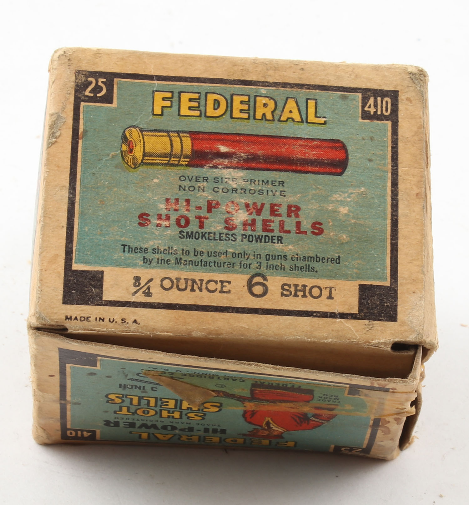 Federal Cart. Co., HI-POWER, 410ga., 3'', 1pc., Full, shot size 6, Black border, blue, yellow and red box with Trap Shooter, box has age soiling with scuffing, has tape to seam split, paper shells are excellent. Grade: Good ++ - Value: 20 to 80