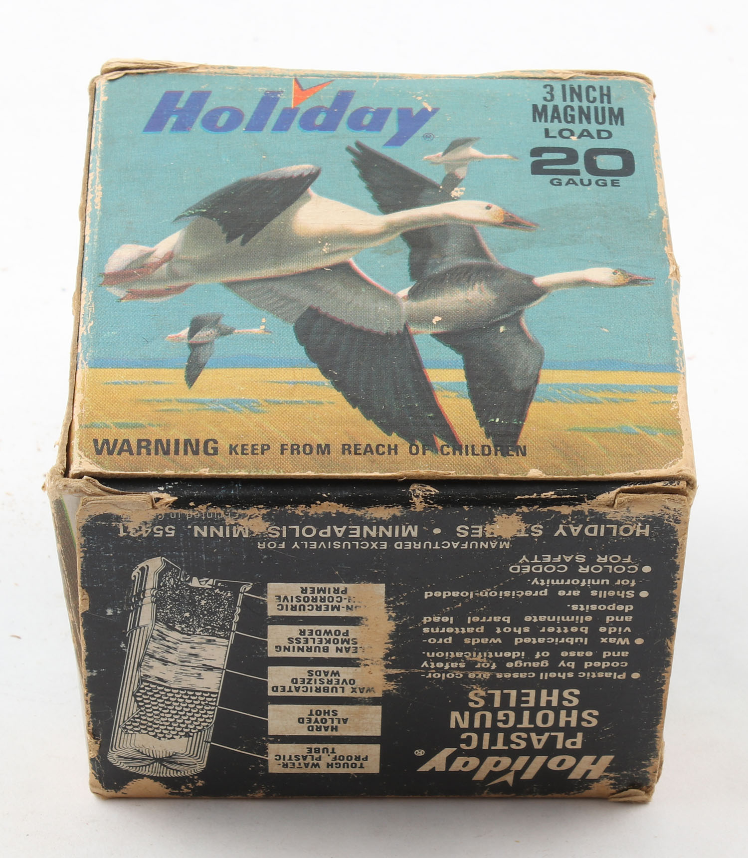 Holiday, Snow Goose, 20ga, 1pc., Empty, 3'' Magnum, shot size 4, multi color graphics by Les Kouba, box has age soiling & edge wear with great color. Grade: Very Good - Value: 10 to 60