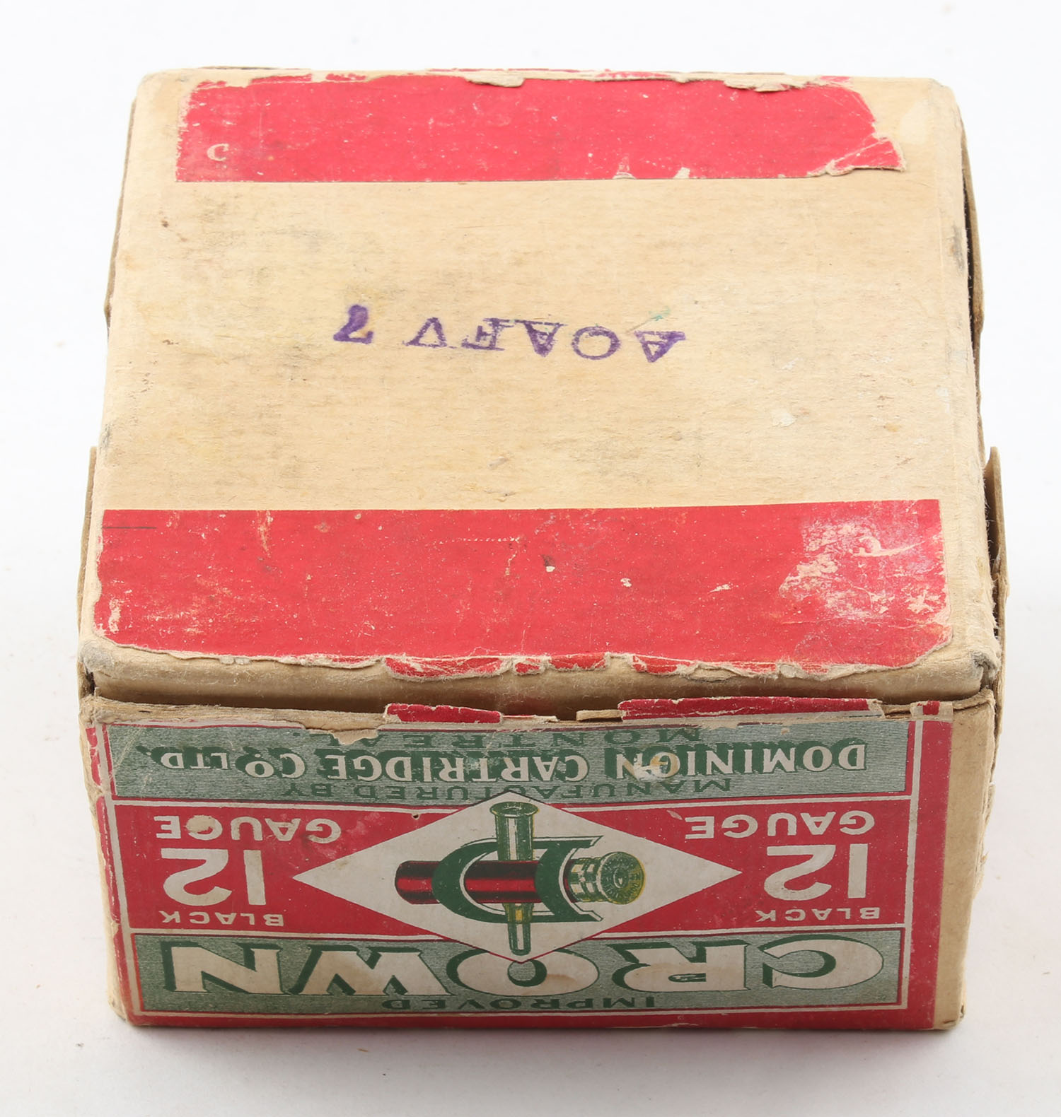 RARE Dominion Cartridge Co, CROWN, 12ga., 2pc., Empty, shot size 3, has early Bent D Logo, box has edge & corner wear, has scuffing with a partial seam split, label is intact with excellent colors. Grade: Very Good ++ - Value: 50 to 200
