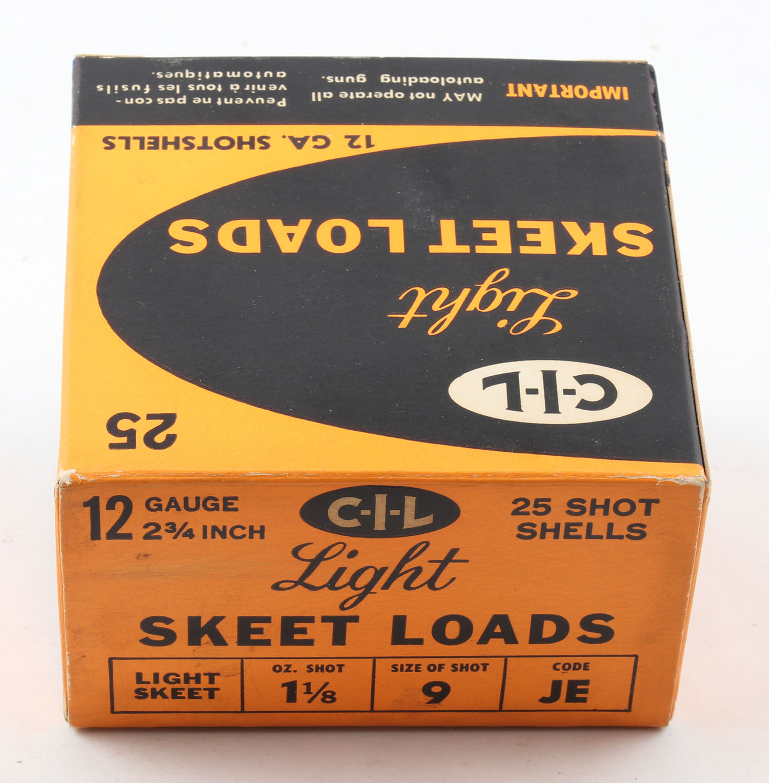 CIL, Light Skeet Loads, 12ga., 1pc., Empty, shot size 9, 2 3/4'', multi-colored box, box is very solid with excellent colors, corners are sharp, edges are crisp. Grade: MINT - Value: 10 to 50