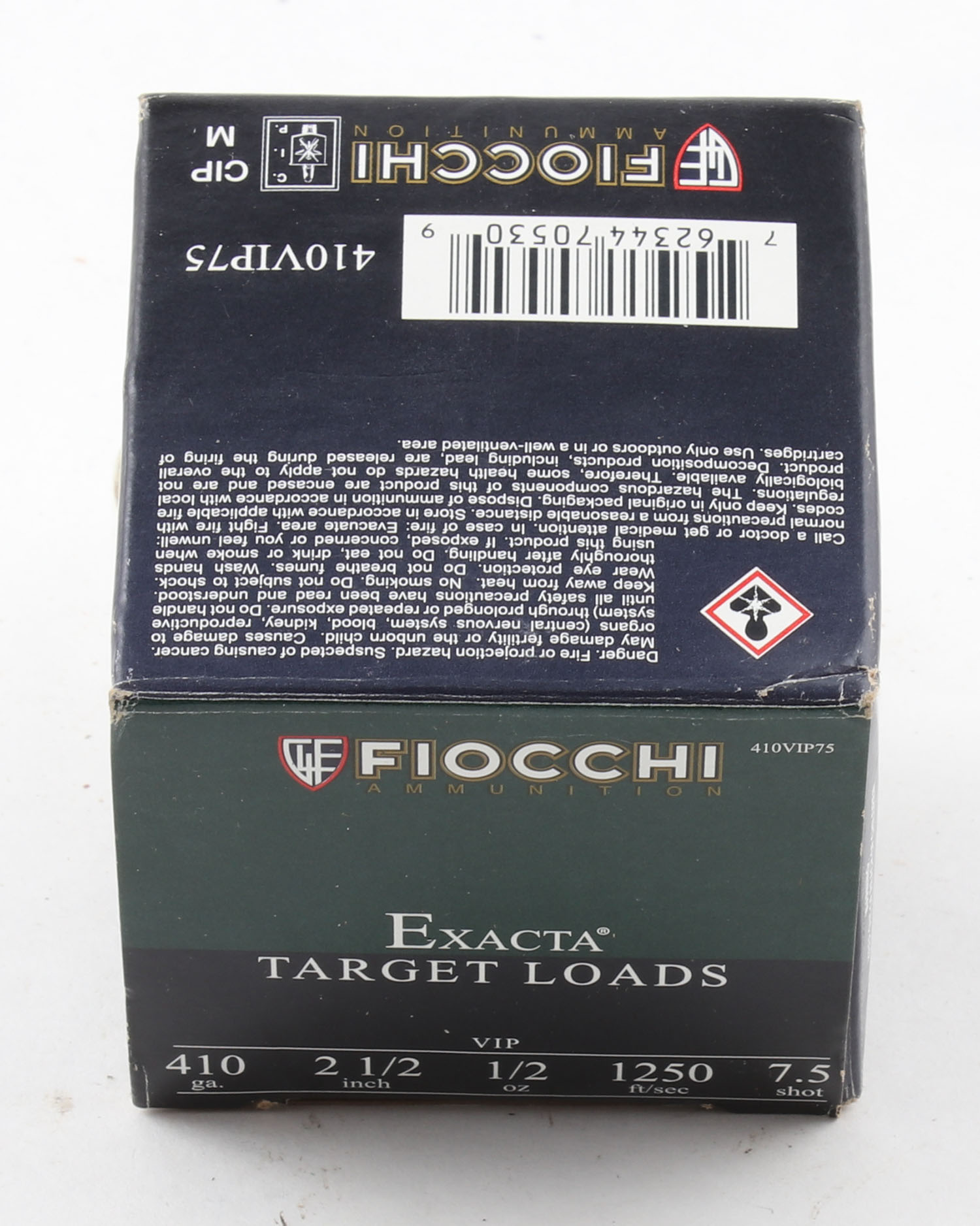 Fiocchi, Exacta Target Loads, 410ga., 1pc., Full, shot size 7 1/2, 2 1/2'', multi-colored box, box is very solid with excellent color, plastic shells are excellent. Grade: Excellent - Value: 10 to 50