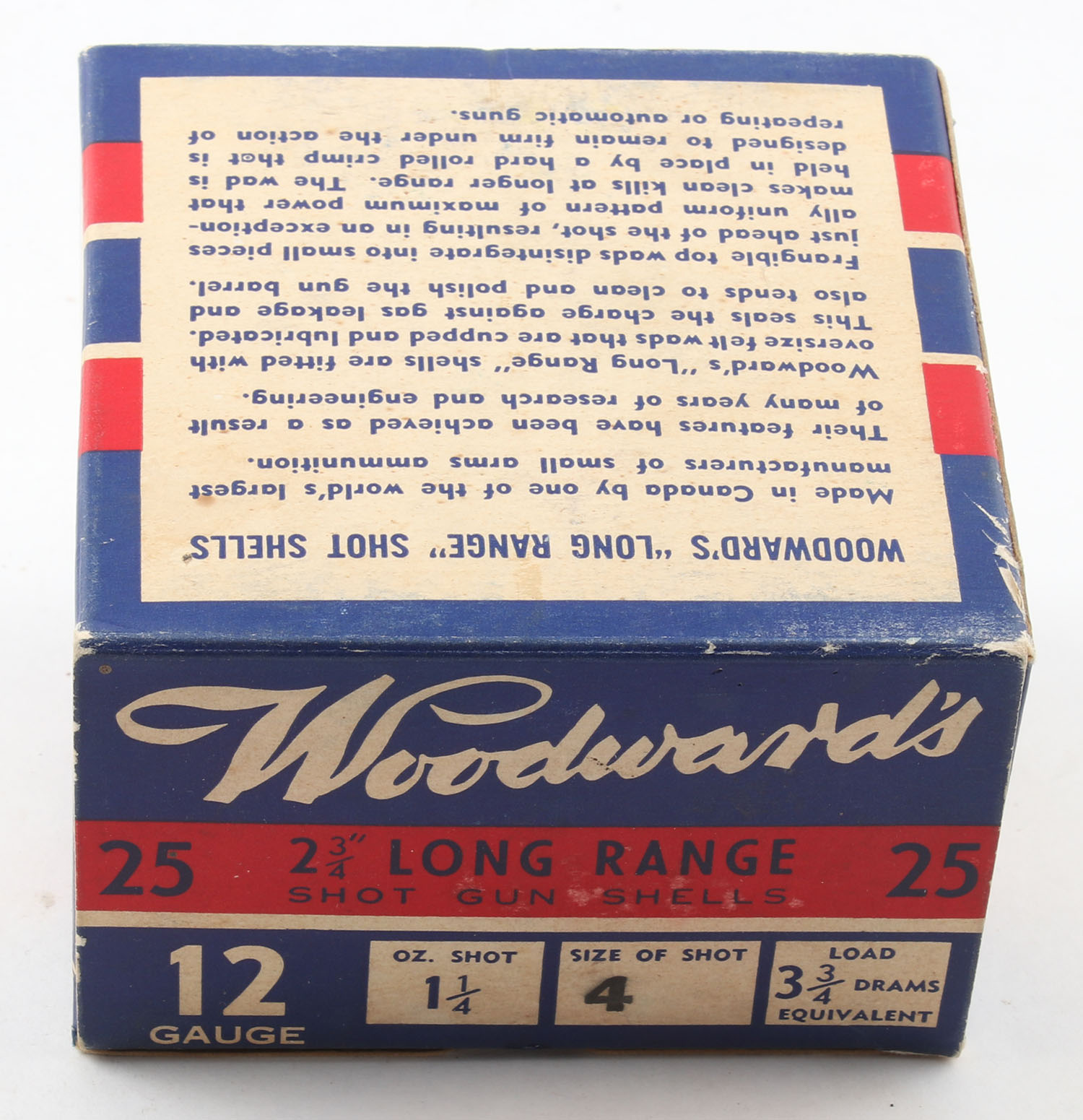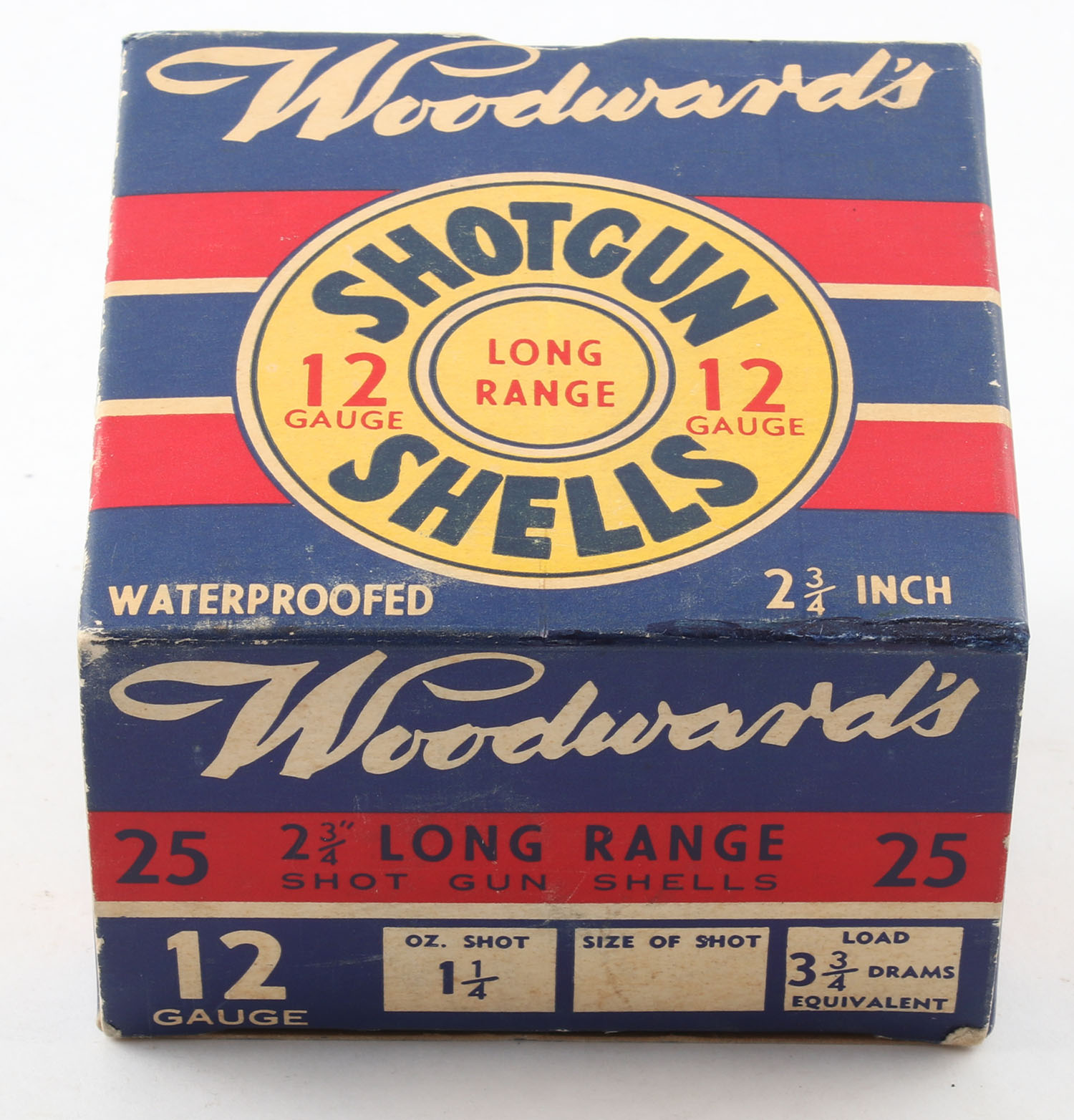 Woodward's, Long Range, 12ga., 1pc., Empty, shot size 4, 2 3/4'', multi-colored box, box is very solid with excellent color, bottom right corner has been touched up with what appears blue marker. Grade: Excellent - Value: 10 to 50