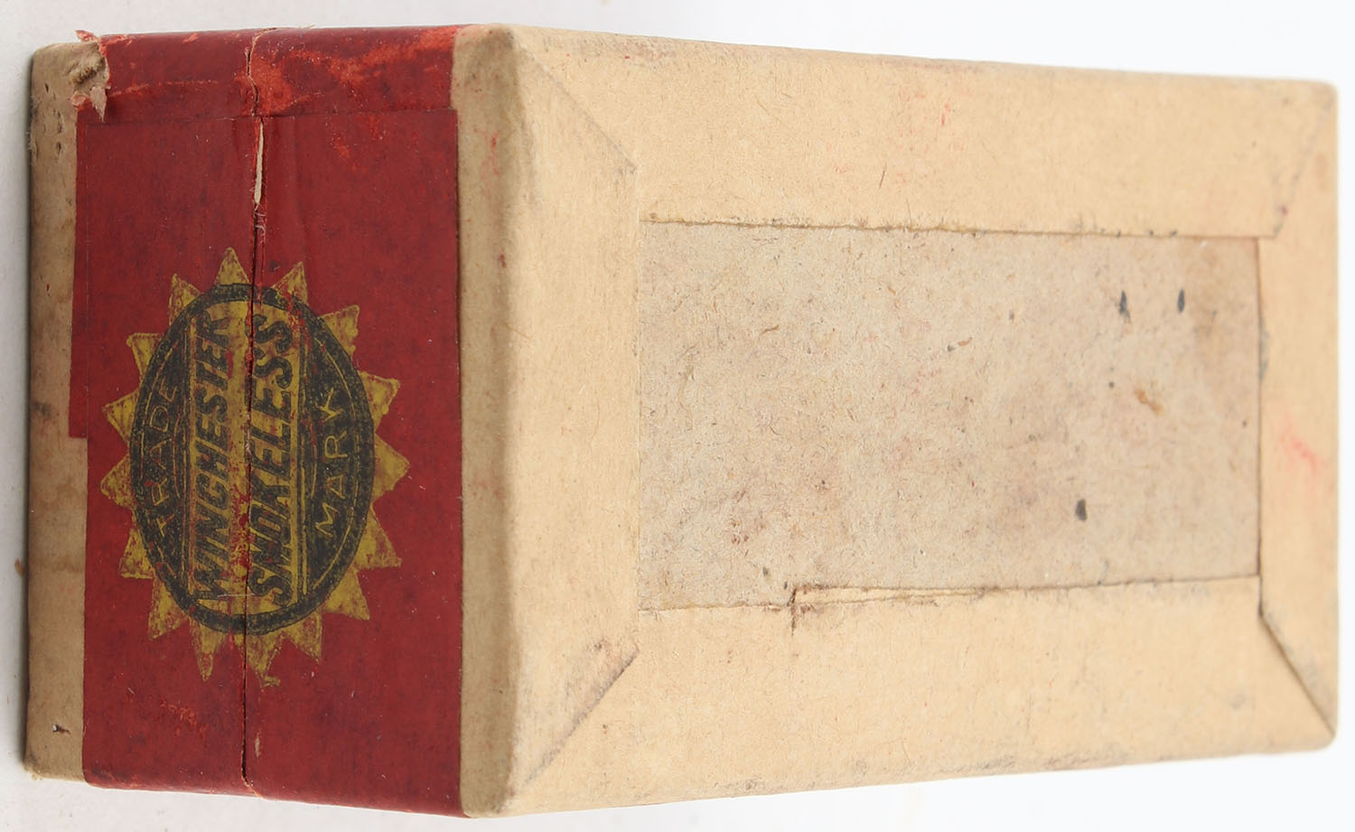 Winchester, Smokeless, .22 W.R.F. Hollow Point, RR: WRA-163 WRF-40, Full with insert, 2pc. Buff box with red top & side sealing labels, box is solid with very good color, minor age soiling, some shelf & edge wear, minor corner wear, labels are intact, insert is excellent, ammo is excellent. Grade: Very Good ++ - Value: 150 to 225