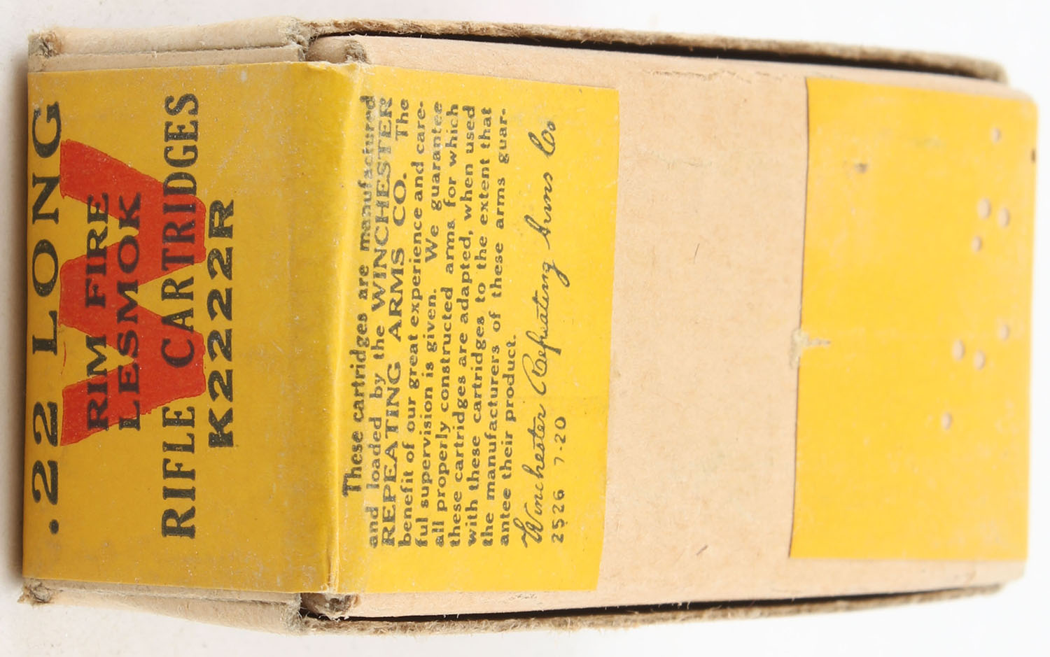 Winchester, Lesmok Rifle Cartridges, .22 Long, RR: WRA-179 L-58b, FULL & SEALED, 2pc. Buff box with green & yellow wraparound label, box is solid with excellent color, very minor color fading, corners are mostly sharp, edges are crisp, label is intact. Grade: Excellent ++ - Value: 80 to 120