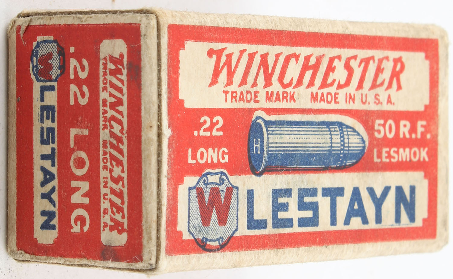 Winchester, Lestayn, .22 Long, RHWeb: WRA-13.5 L-1, Full, 1pc. Red white & blue box, box is solid with very good to excellent color, very minor age soiling & shelf wear, minor corner wear, edges are mostly crisp, end flaps are solid, ammo is very good. Grade: Very Good ++ - Value: 70 to 100