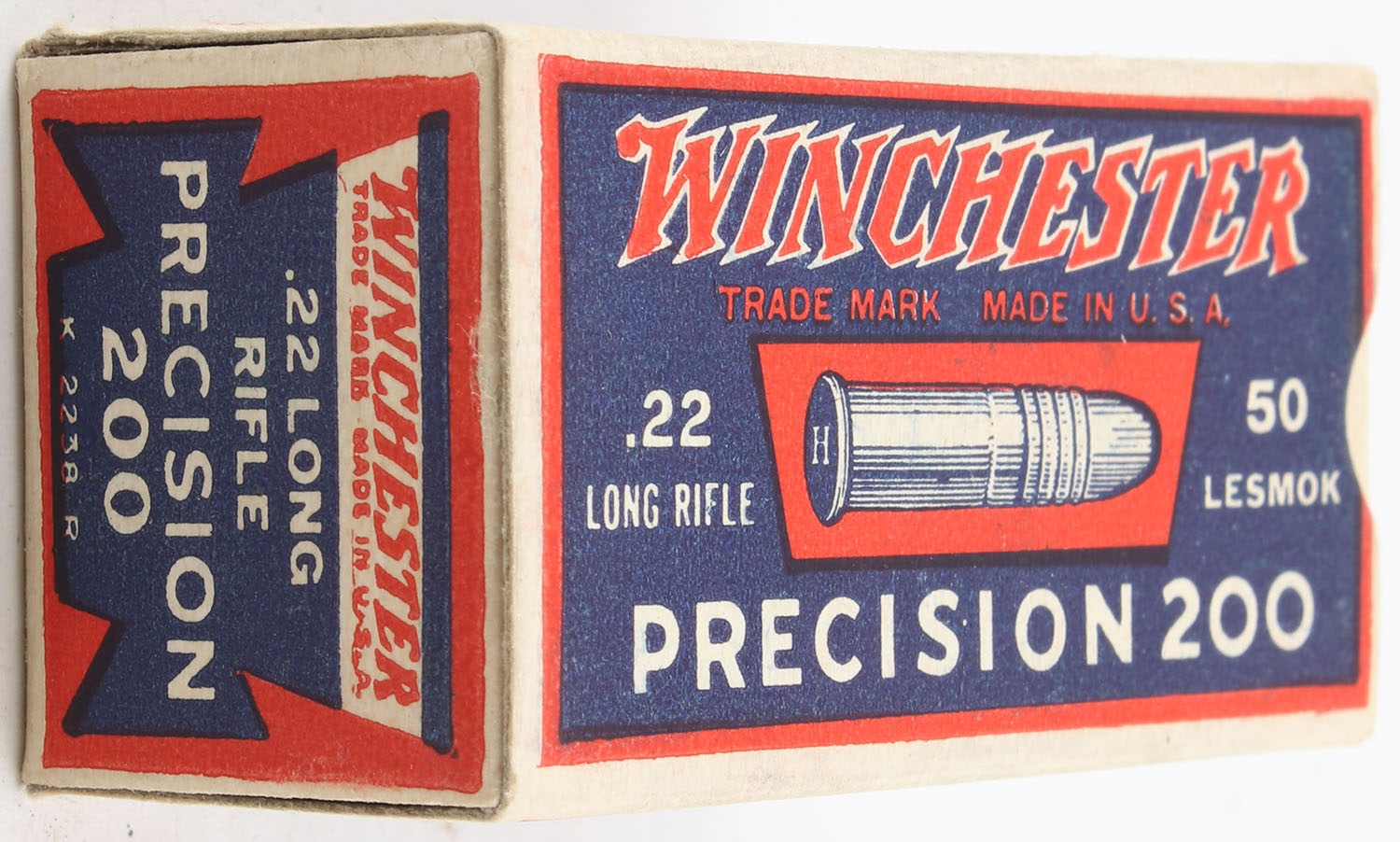 Winchester, Precision 200, .22 Long Rifle, RHWeb: WRA-53 LR-11e, Partial 47rds., 1pc. Blue red & white box, box is near mint with minty color, only very minor shelf wear on bottom, corners are sharp, edges are crisp, end flaps are solid, ammo is excellent. Grade: Excellent ++ - Value: 120 to 180