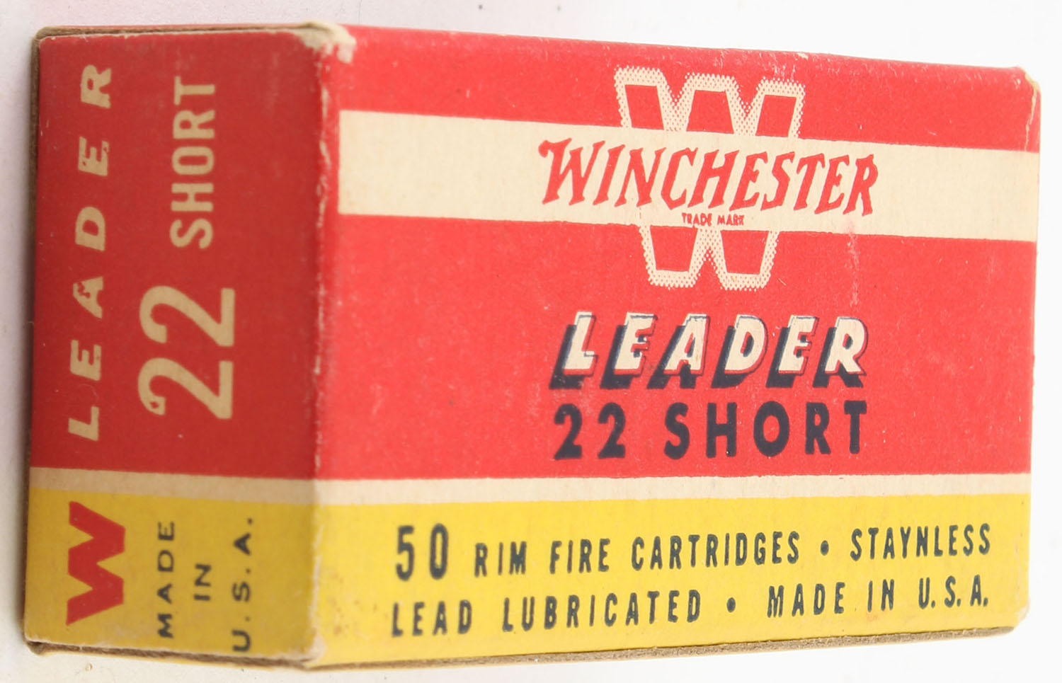 Winchester, Leader, .22 Short, RHWeb: WRA-55 S-2b, Full, 1pc. Red yellow & white box, box is solid with excellent color, very minor age soiling & corner wear, edges are mostly crisp, end flaps are solid, ammo is very good. Grade: Excellent - Value: 12 to 18