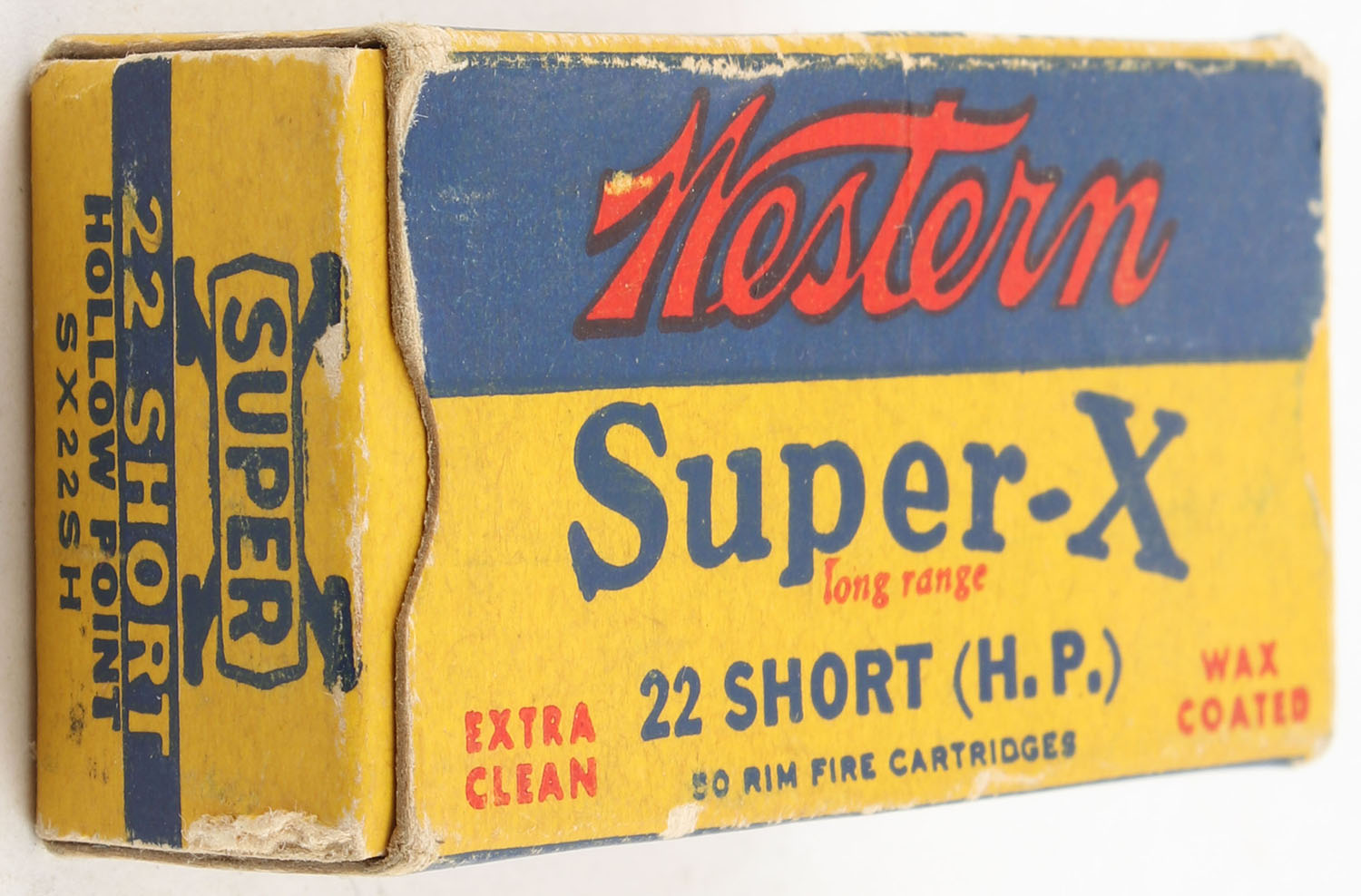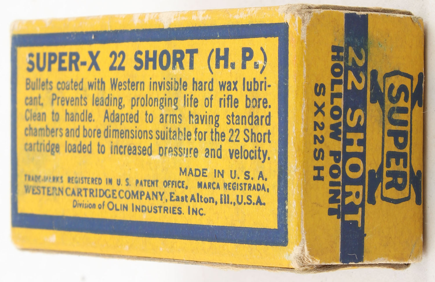 Western, Super-X, .22 Short Hollow Point, RHWeb: WCC-Super-X-Shorts SHP-25, Full, 1pc. Yellow blue & red box, box is solid with very good color, minor age soiling & edge wear, some corner wear, edges are crisp, end flaps are solid, ammo is excellent to minty. Grade: Very Good ++ - Value: 10 to 15
