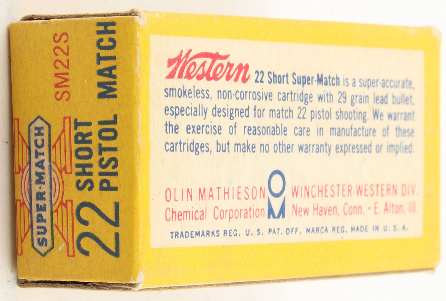 Western, Super-Match, .22 Short, Pistol Match, RHWeb: WCC-51.5, full, 1pc. Yellow white & red box, box is solid with very good to excellent color, minor age soiling, corners are mostly sharp, edges are crisp, end flaps are solid, ammo is excellent. Grade: Excellent - Value: 16 to 24