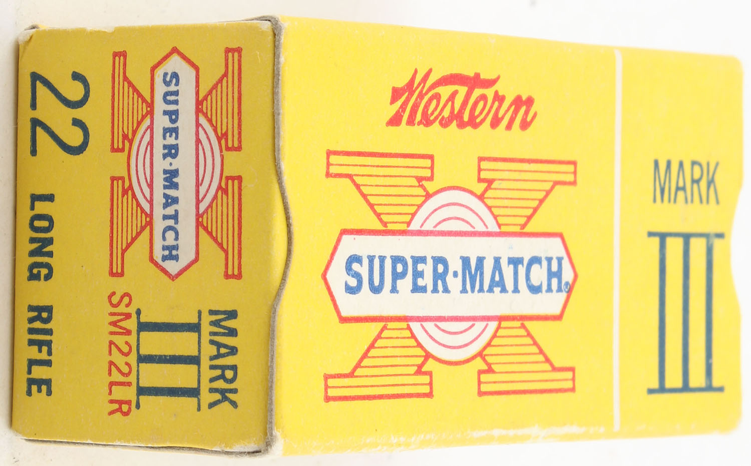 Western, Super-Match Mark III, .22 Long Rifle, RHWeb: WCC-51.3 LR-2b, Full, 1pc. Yellow red & white box, box is solid with excellent color, very minor edge & corner wear, end flaps are solid, ammo is excellent. Grade: Excellent + - Value: 8 to 12