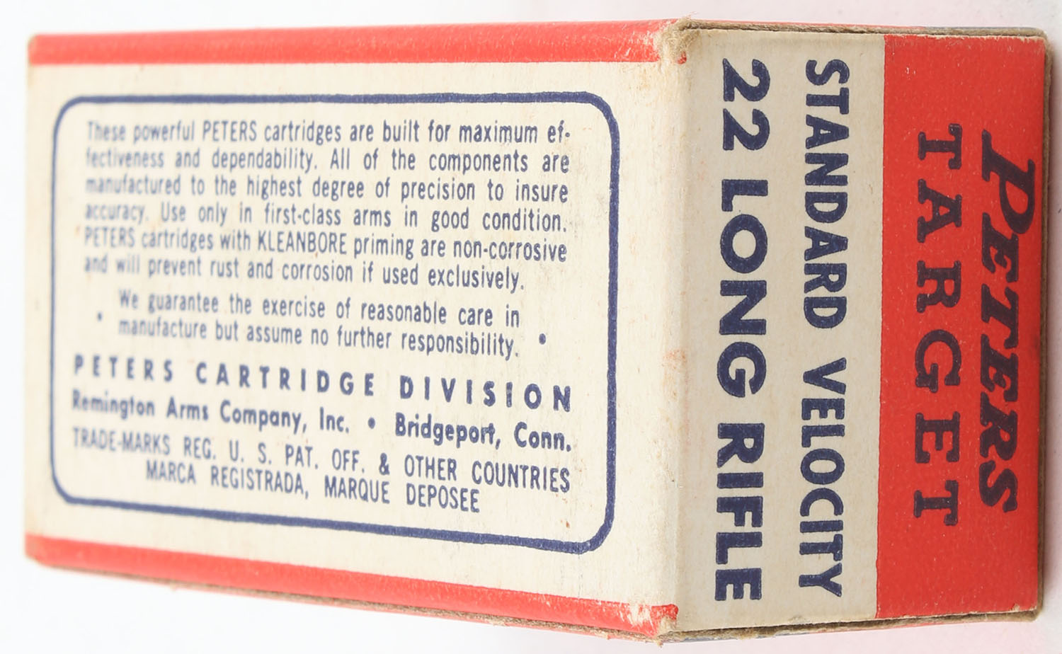 Peters, Target, .22 Long Rifle, Standard Velocity, RHWeb: PCC-54D LR-4, Full, 1pc. Red black & white box, box is near mint with minty color, only very minor corner wear, edges are crisp, end flaps are solid, ammo is minty. Grade: Excellent ++ - Value: 6 to 12