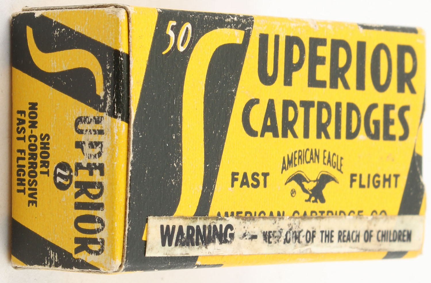 American, Superior Cartridges, .22 Short, Fast Flight, RHWeb: ACC-4 S-1a, Full, 1pc. Yellow & black box with white child warning label, box is near mint with minty color, only very minor age soiling to child warning, corners are mostly sharp, edges are crisp, end flaps are solid, ammo is minty. Grade: Excellent ++ - Value: 20 to 30