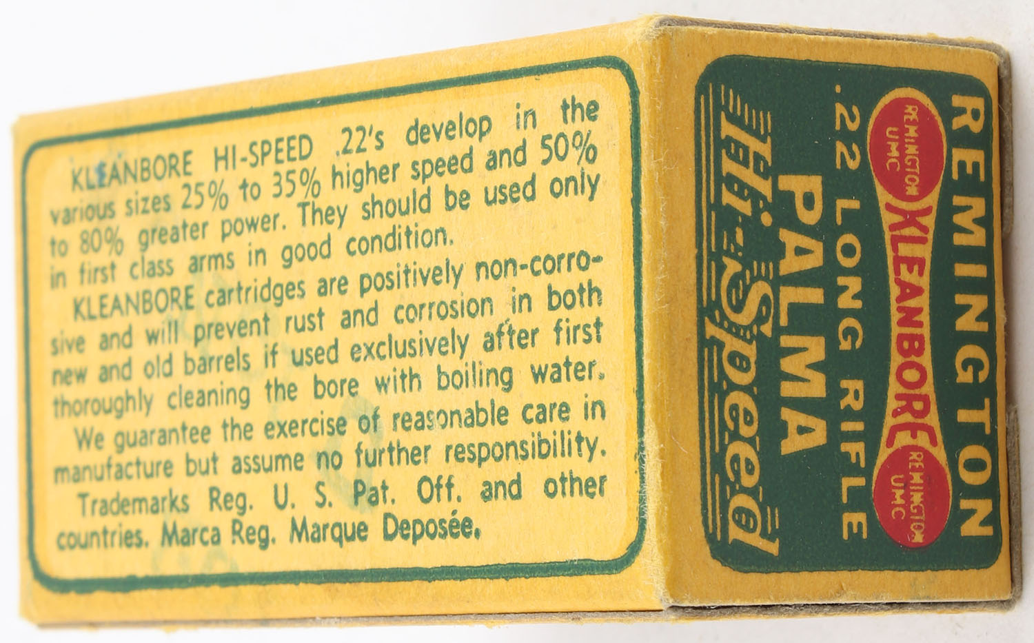 Remington, Kleanbore Palma Hi-Speed, .22 Long Rifle, RHWeb: REM-52 LR-12b, Partial 47rds. 1pc. Green buff & red dog bone box, box is solid with excellent color, corners are mostly sharp, edges are crisp, end flaps are solid, ammo is excellent. Grade: Excellent ++ - Value: 60 to 90