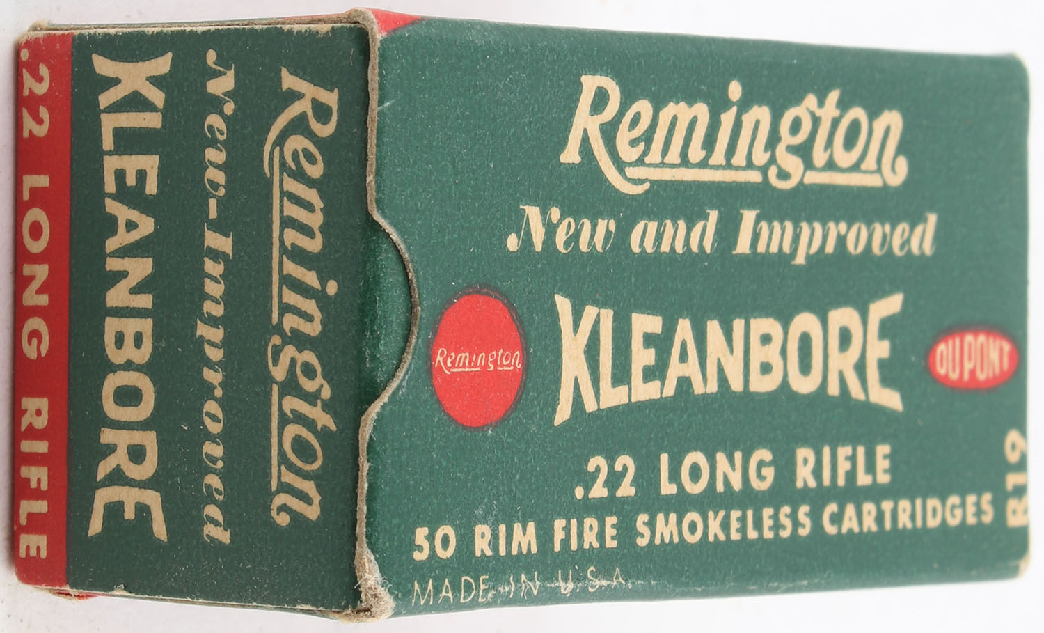 Remington, New and Improved Kleanbore, .22 Long Rifle, RHWeb: REM-11 LR-1, Full, 1pc. Green buff & red box, box is solid with excellent color, very minor corner wear, edges are crisp, end flaps are solid, ammo is excellent. Grade: Excellent + - Value: 8 to 12