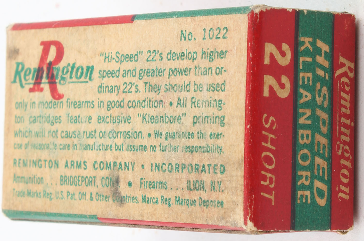 Remington, HiSpeed, .22 Short, RHWeb: REM-15 S-1, Full, 1pc. Red green & white box, box is solid with good color, age soiling & shelf wear, tape residue on left end flap, very minor corner wear, edges are crisp, end flaps are solid, ammo is excellent. Grade: Good ++ - Value: 6 to 10