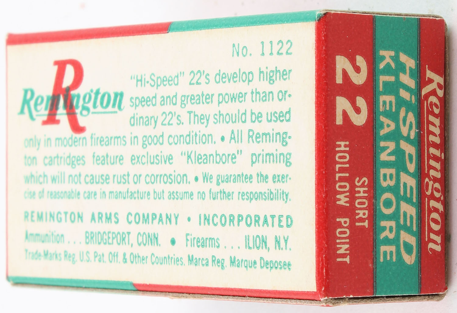 Remington, HiSpeed, .22 Short Hollow Point, RHWeb: REM-16 S-3, Full, 1pc. Red green & white box, box is MINT with minty color, corners are sharp, edges are crisp, end flaps are solid, ammo is minty. Grade: MINT - Value: 10 to 15