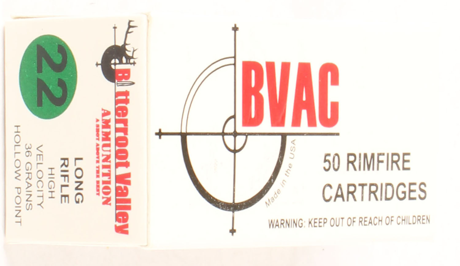 Bitterroot Valley, .22 Long Rifle Hollow Point, High Velocity, RHWeb: BVAC-1 LR-2, Full, 1pc. White & red box, box is MINT with minty color, sharp corners, crisp edges, rigid end flaps, ammo is mint. Grade: MINT - Value: 36 to 54