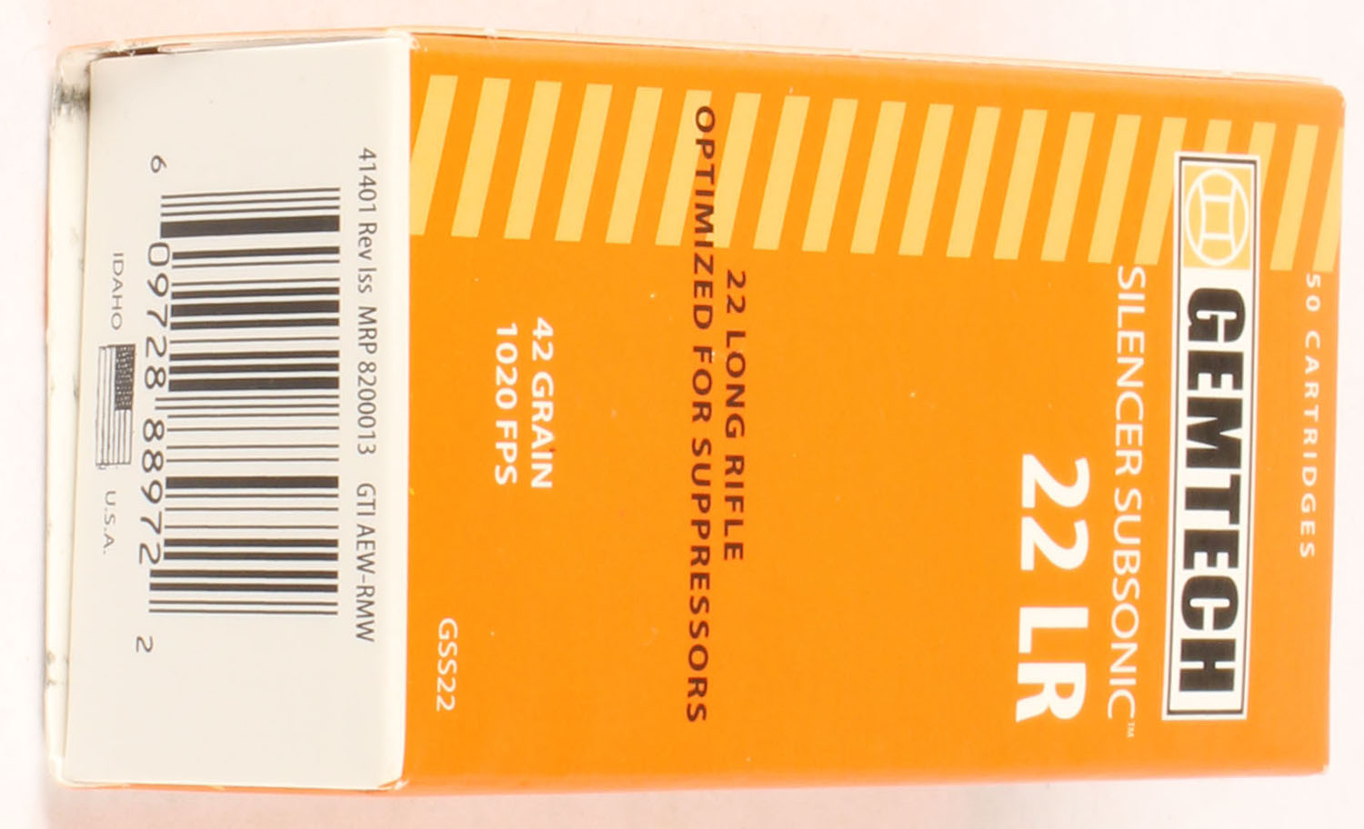 Gemtech, Silencer Subsonic .22 Long Rifle, 42 Grain Lead Round Nose, 1020 FPS, RHWeb: GEMT-1 LR-1, Full, 1pc. Orange white & black box, box is MINT with minty color, corners are sharp, edges are crisp, end flaps are solid, ammo is minty. Grade: MINT - Value: 4 to 10