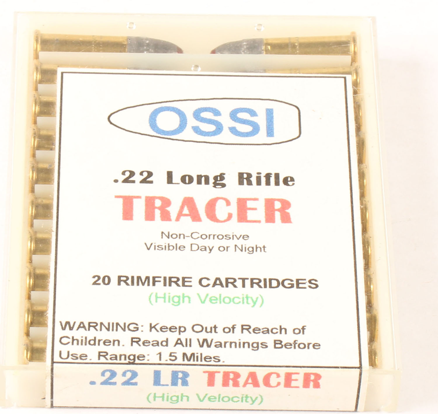 OSSI, Tracer, .22 Long Rifle, High Velocity, Non-Corrosive, RHWeb: OSSI-1 LR-2, FULL & SEALED, 2pc. White plastic tray with white sealing label, box is MINT with minty colors, label is intact, ammo appears mint. Grade: MINT - Value: 16 to 24