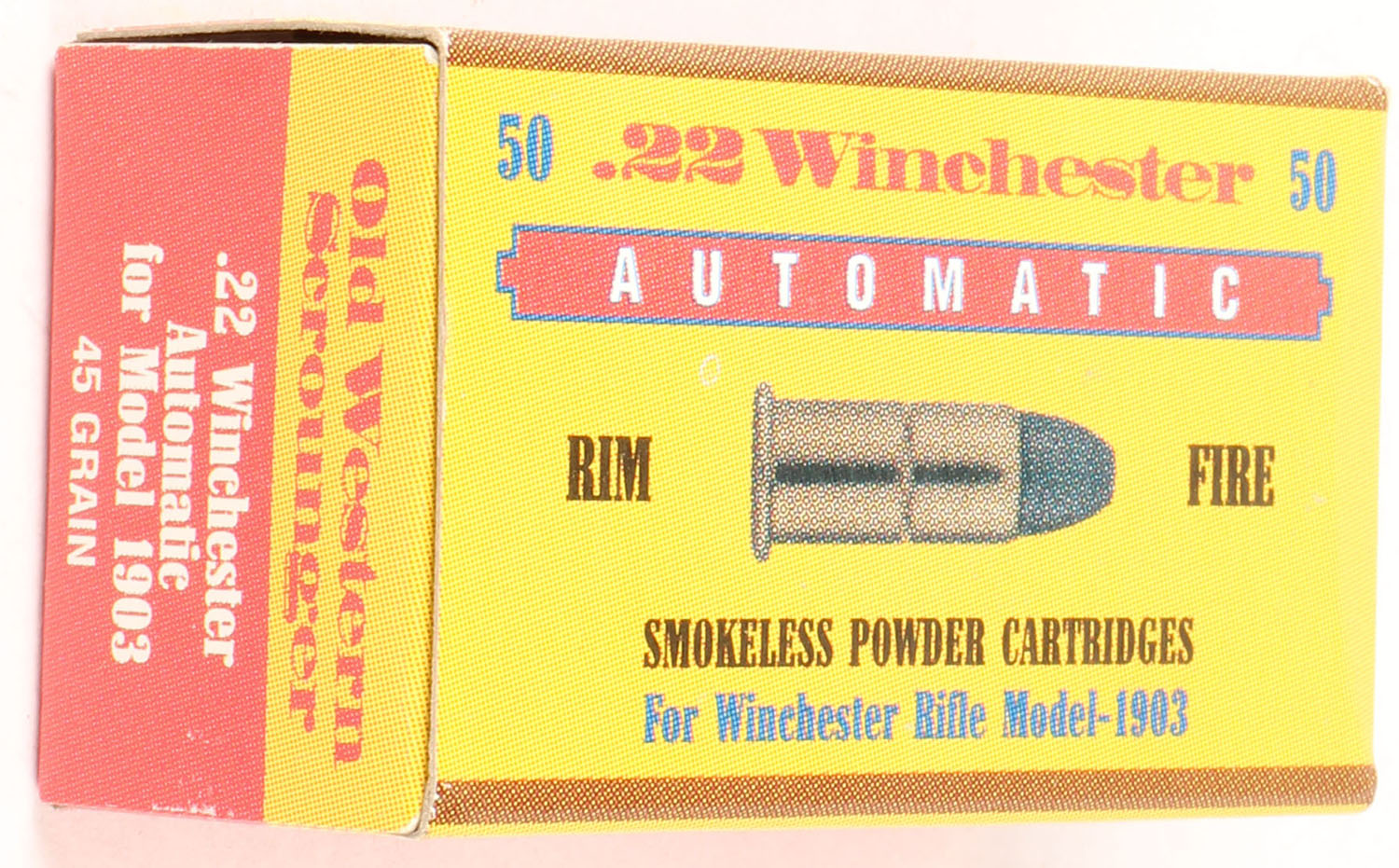 Old Western Scrounger, .22 Winchester Automatic, RHWeb: IT-10 WA-1, Full, 1pc. Yellow & red box, box is MINT with mint color, sharp corners, crisp edges, rigid end flaps, ammo is mint. Grade: MINT - Value: 30 to 45