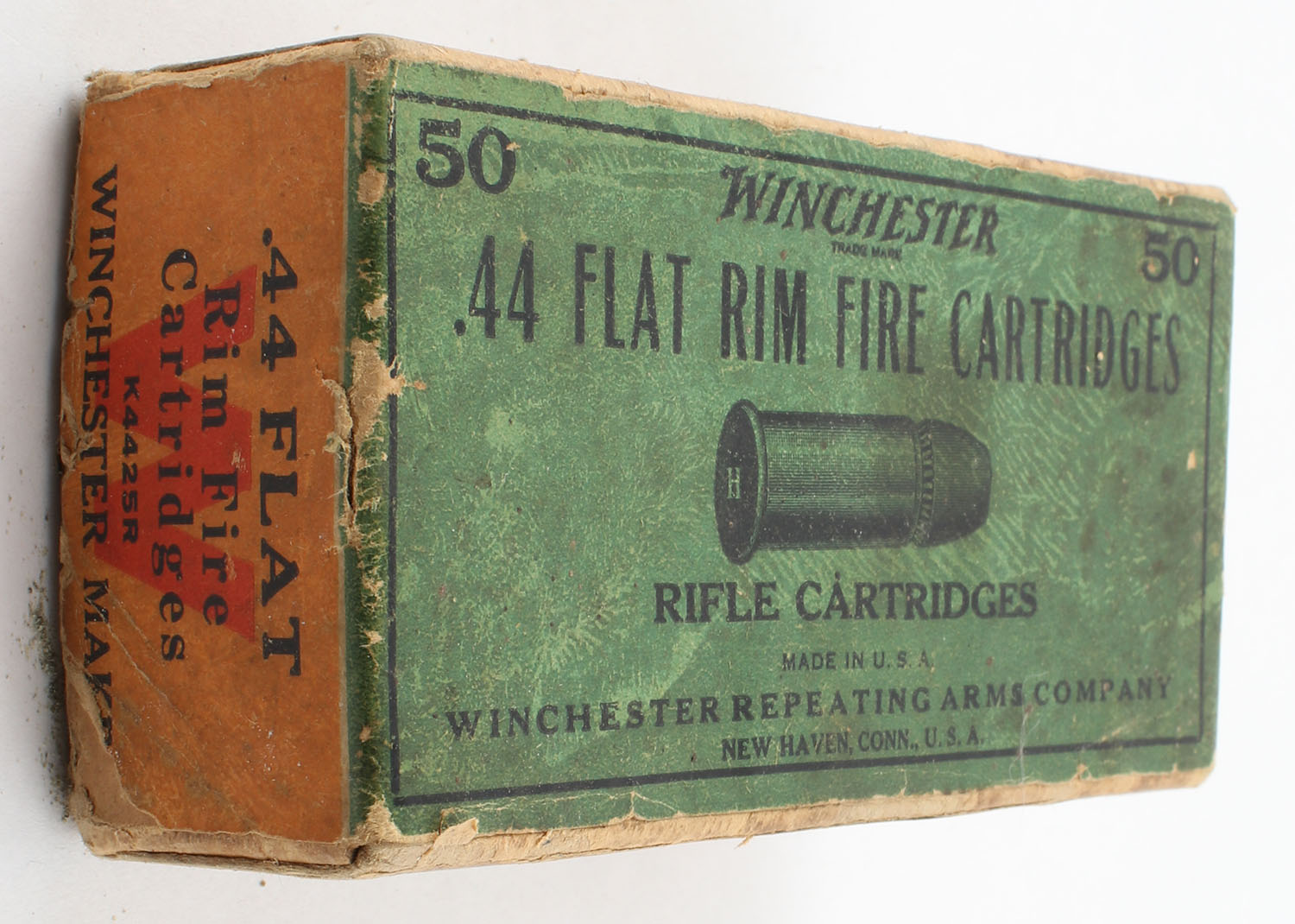 RARE! Winchester, .44 Flat Rim Fire Cartridges, Full, 2pc. Buff box with green & orange wraparound label, box is solid with age soiling to label & box, minor edge & corner wear, label is intact, ammo is good. Grade: Very Good ++ - Value: 1500 to 2000