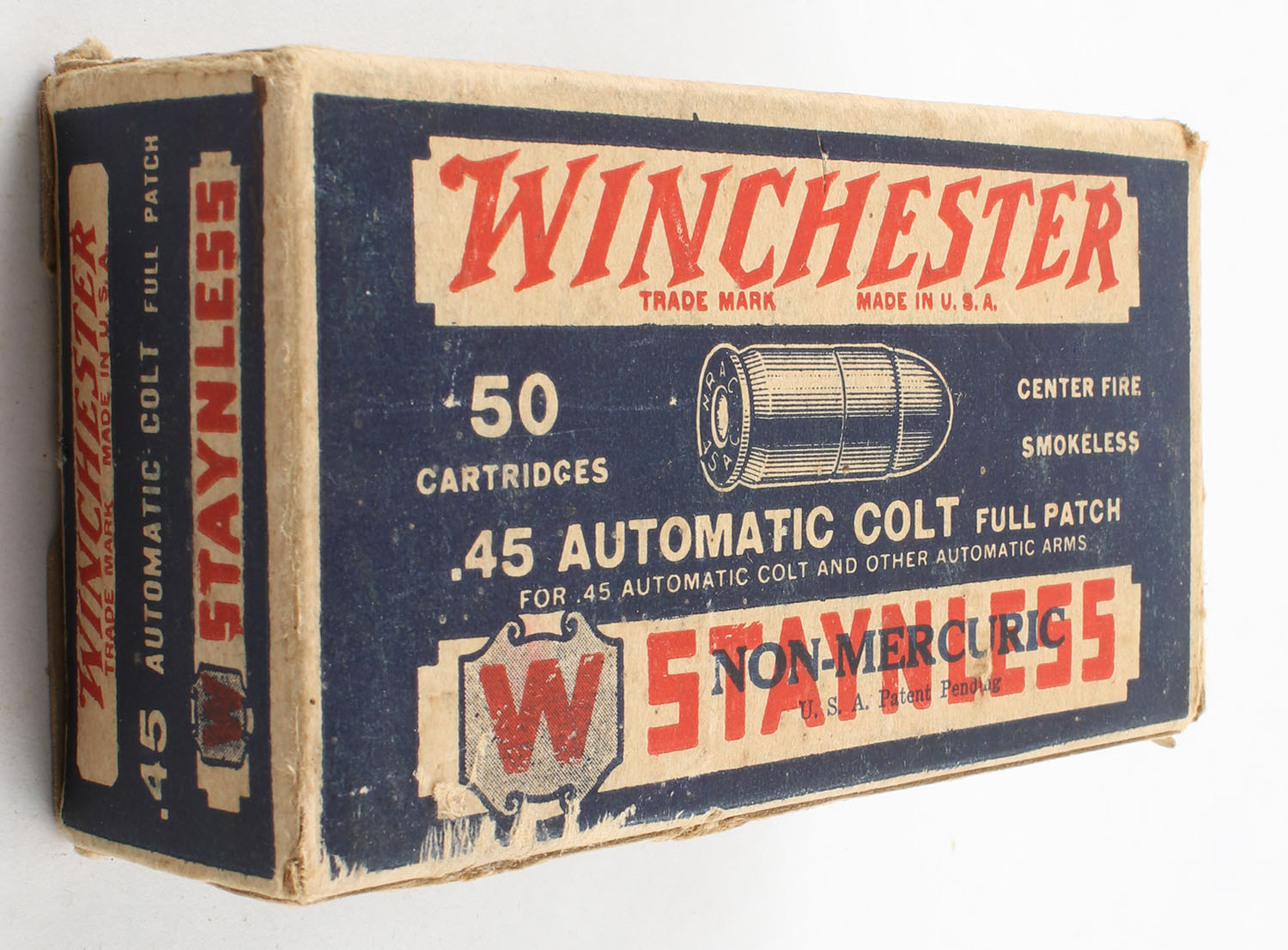 Winchester, Non-Mercuric Staynless, .45 Auto Colt, Full, 1pc., Blue white & red box, box is solid with very good color, has light age soiling, some edge & corner wear, end flaps are solid, ammo is very good. Grade: Very Good ++ - Value: 20 to 80