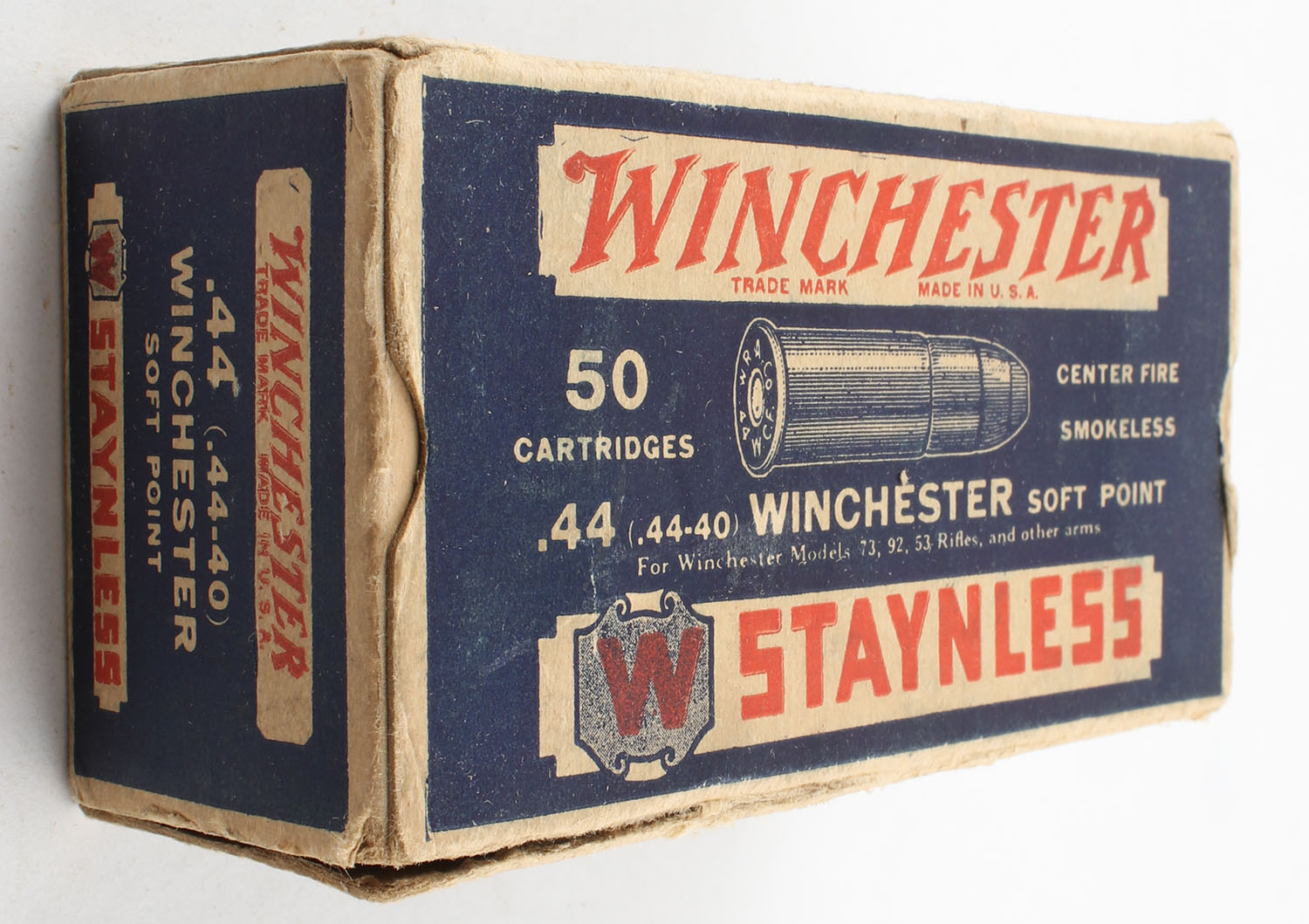 Winchester, Staynless, .44 Winchester (.44-40), Soft Point, Full, 1pc., Blue white & red box, box is solid with very good color, box has very minor age soiling, light edge & corner wear, end flaps are solid, ammo is excellent. Grade: Very Good ++ - Value: 50 to 150