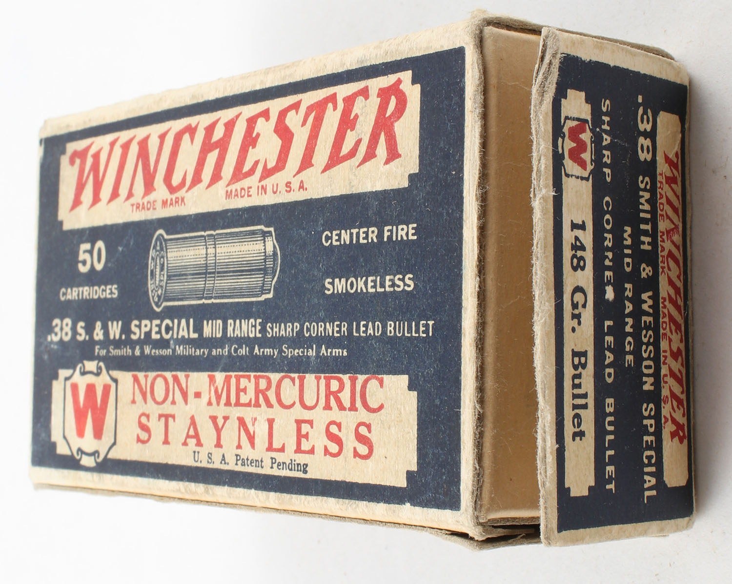 Winchester, Non-Mercuric Staynless, .38 Smith & Wesson Special, 148 Grain Sharp Corner Lead Bullet, Full, 1pc., Blue white & red box, box is very solid with great color, has minor edge & corner wear, right end flap is torn, left end flap is solid, ammo is excellent. Grade: Very Good ++ - Value: 20 to 100