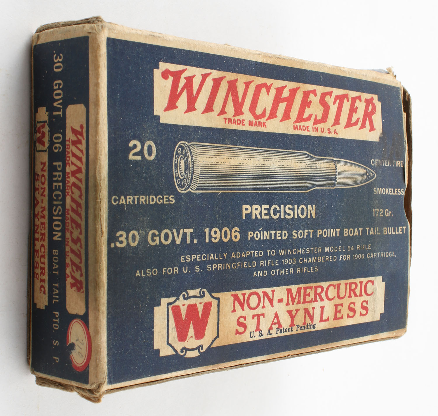 Winchester, Non-Mercuric Staynless, .30 Govt. 1906, 172 Gr. Pointed Soft Point Boat Tail Bullet, Full, 1pc., Blue white & red box, box has light age soiling, corner & edge wear, right end flap is torn, left end flap is solid, ammo is very good. Grade: Good ++ - Value: 20 to 80