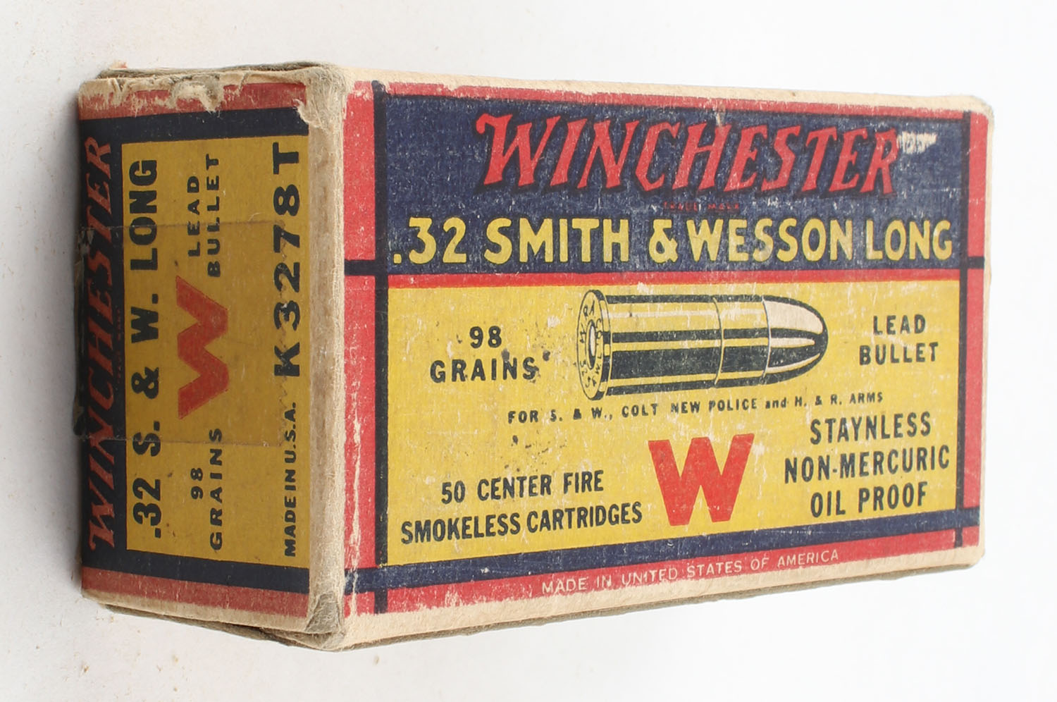 Winchester, Smokeless Cartridges, .32 Smith & Wesson Long, 98 Grains Lead Bullet, Full, 1pc. Yellow blue & red box, box has light age soiling with great color, has scuffing with tape on one side, end flaps are solid, ammo is excellent. Grade: Very Good + - Value: 20 to 60