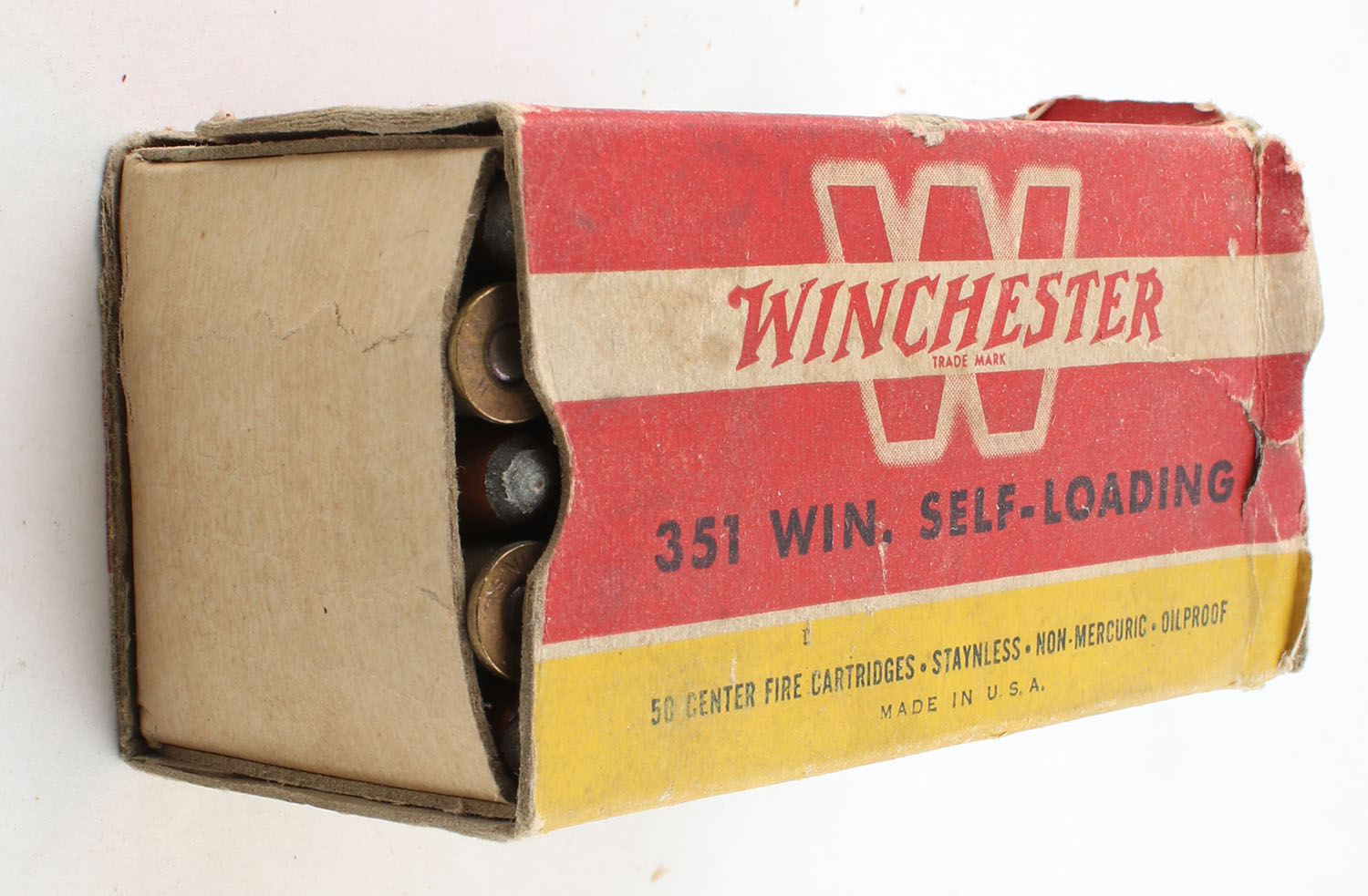 Winchester, .351 Win. Self-Loading, 180 Grain Soft Point, Partial 49rds., 1pc. Red yellow & white box, box has scuffing with edge & corner wear, box is missing left end flap & right end flap is torn, ammo is very good. Grade: Good ++ - Value: 50 to 150