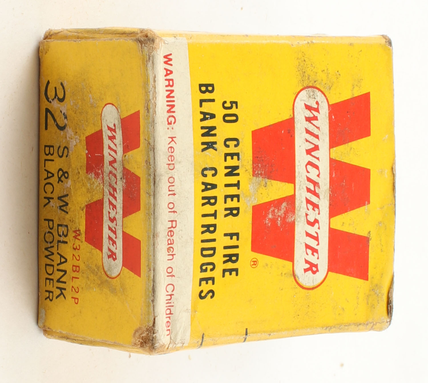 Winchester, Center Fire Blank Cartridges, .32 Smith & Wesson, Black Powder, Full, 1pc. Yellow red & white box, box has age soiling with edge & corner wear, flaps are solid, ammo is excellent. Grade: Good ++ - Value: 10 to 30